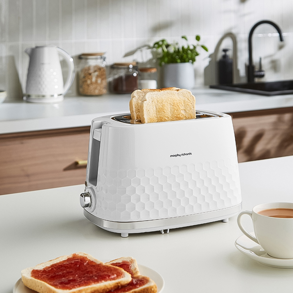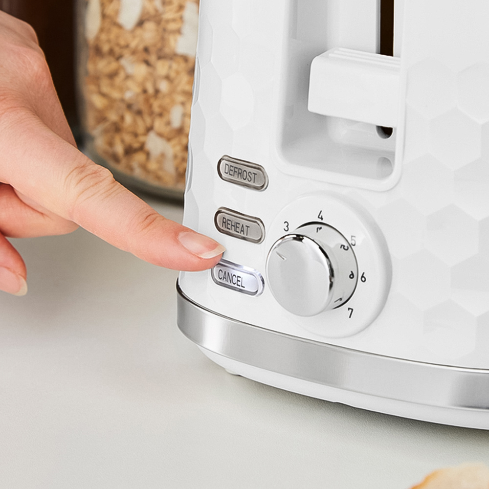 Enjoy perfectly cooked toast, just the way you like it, with the Morphy Richards 220034 Hive White Two Slice Toaster. The perfect combination of style and performance, this toaster looks great on your countertop while offering variable browning controls so you can enjoy perfectly toasted slices every time. It is packed with a built-in cord, which keeps counters free of clutter. The toaster also has settings for reheating cold slices or toasting frozen bread and a removable crumb tray for mess-free toasting. With its sleek design and contemporary look, the Hive toaster is a must-have for any kitchen.