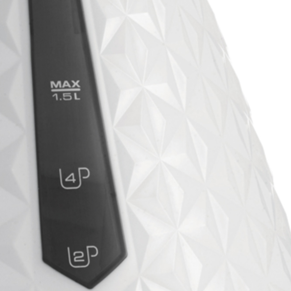 Give your kitchen a refreshing look with this Morphy Richards 108134 Vector 1.5L Pyramid Kettle. With its three-D patterned finish and sleek design, this modern appliance is an excellent addition to any countertop. The 1.5L kettle can quickly boil up to six cups of water at once with its three-kW rapid boiling element. It also features an easy-view water window so you can easily see how much you need without wasting energy or time guessing the amount. The removable limescale filter ensures you get a quality drink every time. Its 360° base makes docking and storage a breeze no matter which direction you place it in.