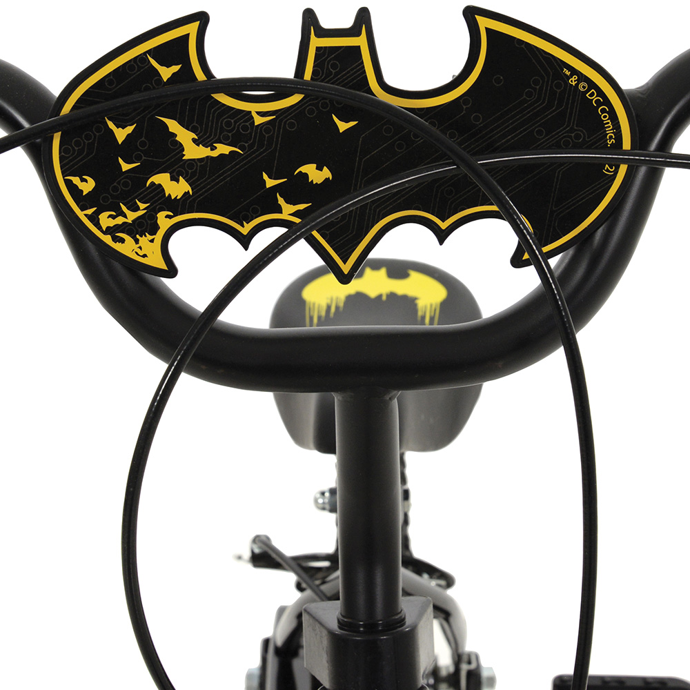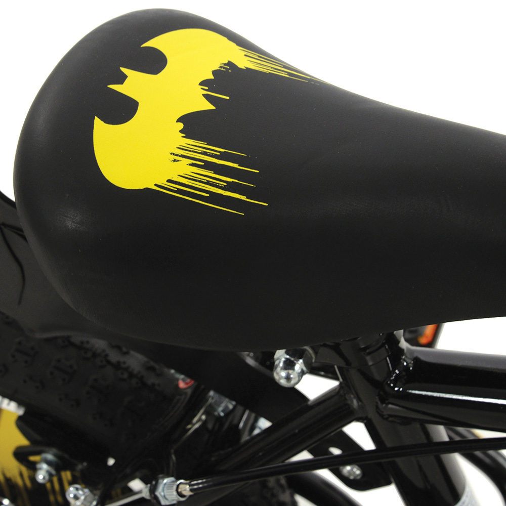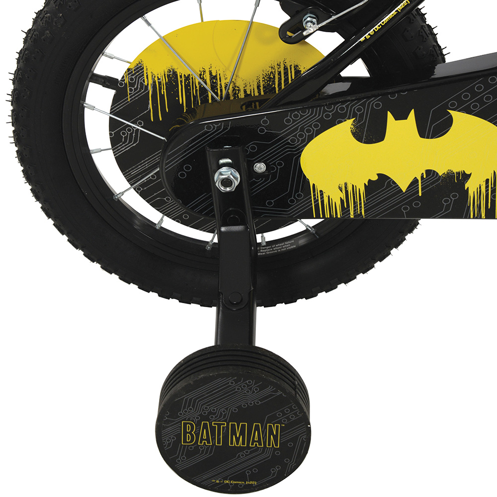 Buckle up for thrilling adventures with the MoVe Batman 14 inch Black Bicycle. Featuring iconic Barman graphics, a shaped plaque, and stabilisers, this bike combines style with stability. The puncture-proof EVA moulded wheels with mag wheel inner provide exceptional stability and grip, ensuring a smooth ride on every mission. The adjustable seat and handlebars allow for a comfortable fit as the children grow. It is built with a durable steel frame. This bike is perfect for children aged three and up. Safety is a priority, with the bike being EN71 tested, CE UKCA compliant, and made with non-toxic materials.