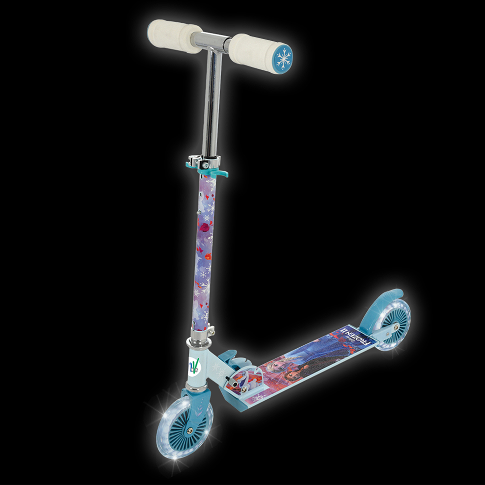 Embark on a journey with the Frozen 2 Folding Inline Scooter with Light Up Wheels, where every ride is a magical adventure! Illuminate your path with motion-activated light-up wheels that add an extra dose of fun and excitement to your frosty escapades. Glide gracefully on the colour-printed anti-slip grip tape. With its quick-folding design, you can easily transport your scooter. Safely navigate through the kingdom with the reactive rear footbrake. Adjust the handlebar height from 74 to 80cm, perfect for growing adventurers. Adorned with character graphics and a fully printed stem wrap inspired by your Frozen favourites, you'll feel like you're riding alongside your beloved characters on their epic journey. Plus, with its robust steel frame and puncture-proof tyres, this scooter ensures confidence and longevity. It's the ideal gift for any Frozen fan, arriving in a full-colour box fit for a royal coronation. Safety is paramount, with EN71-tested and CE UKCA-compliant materials ensuring worry-free rides for adventurers aged 5 and up.