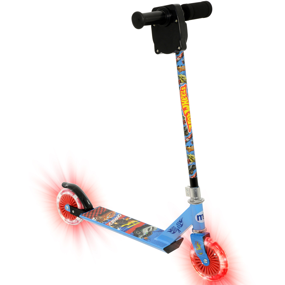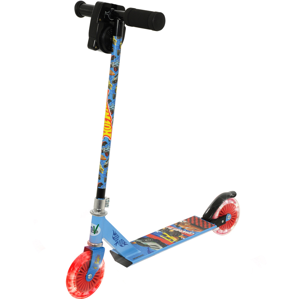 Get ready to start your engines and turbo charge your scooter with the MoVe Hot Wheels Inline Scooter with Light Up Wheels. Simply twist the handle for "vroom " revver sounds. Ride in style with multi-coloured, motion-activated light-up wheels that shine in the dark. Featuring soft-touch handlebar grips, a responsive rear footbrake, and puncture-proof tyres, it ensures a smooth and confident ride every time. Constructed with a sturdy steel frame and puncture-proof tyres, it promises durability and reliability for long-lasting enjoyment. Packaged in a colourful box, it makes an ideal gift option. Safety is paramount, with EN71 testing, CE UKCA compliance, and a maximum user weight of 70kg, suitable for riders aged 5 years and above.