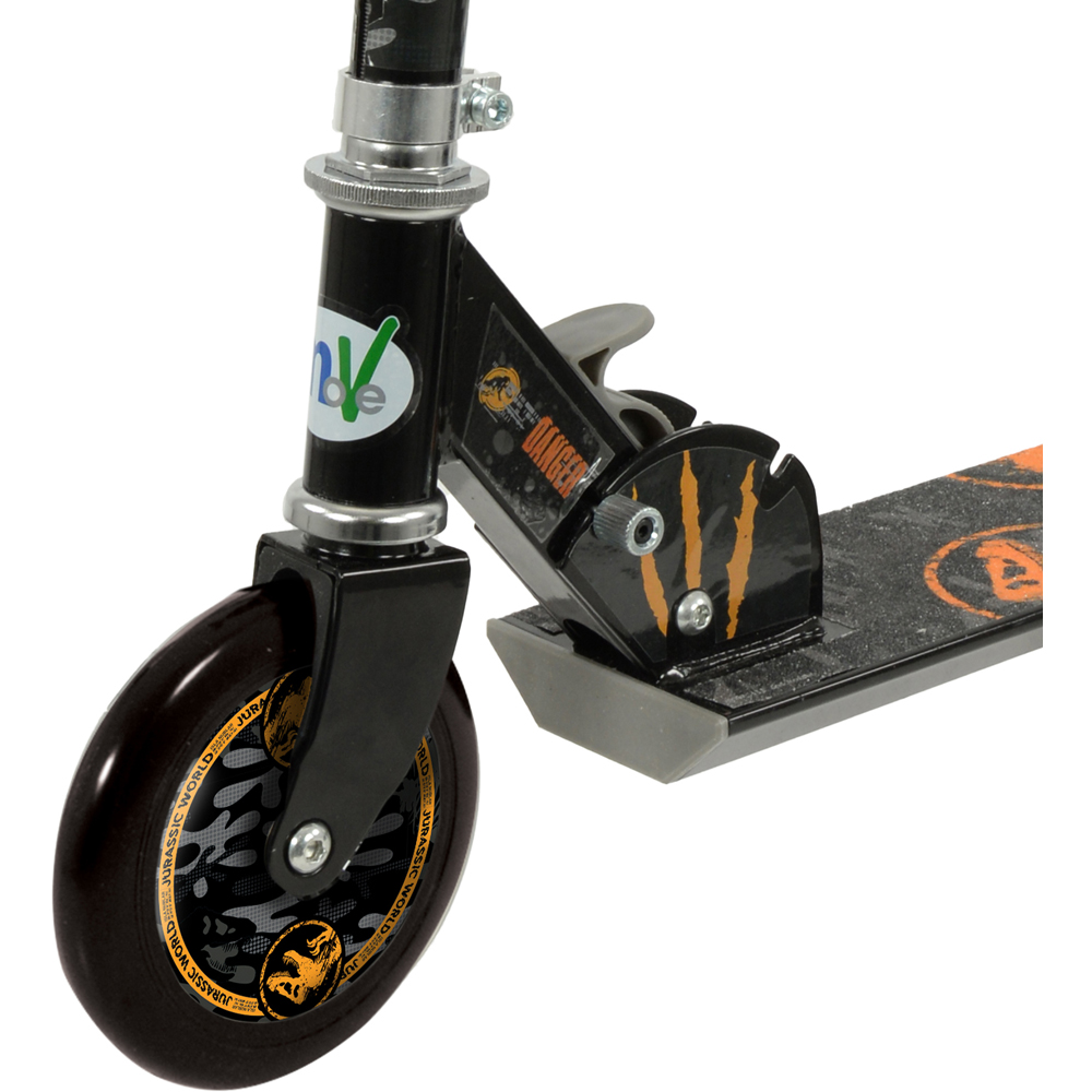 Gear up with the Jurassic World Folding Inline Scooter! Officially licensed, this scooter features character-printed anti-slip grip tape and a full stem wrap, ensuring you ride around Jurassic Park in style. The durable steel frame and puncture-proof PVC wheels guarantee durability and confidence, while the printed graphic wheels add an extra touch of dino flair. With its adjustable handlebar height and quick-folding design, this scooter grows with you and is ready for dino escaping whenever needed. Plus, with no assembly required, you can hit the streets straight out of the box! Whether you're fleeing dinos or simply cruising around, the Jurassic World Folding Inline Scooter is the perfect ride for every young Dino lover. Safety-tested and suitable for ages 5 and up, it's the ideal gift for any Jurassic fan. Unleash your inner Dino and ride in style today!
