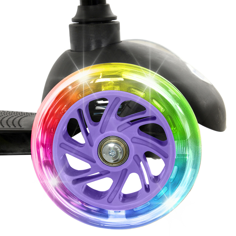 Introducing the MoVe Tilt and Glo Scooter with Lights. Get ready to embark on thrilling adventures with this vibrant scooter designed for little explorers. Featuring motion-activated light-up wheels, watch as they illuminate the path ahead with a mesmerizing display of colours. The star of the show is the multi-coloured light stem featuring three different light modes to choose from. With its responsive tilt and turn steering action, mastering coordination and balance becomes an exciting journey. The scooter boasts a fully anti-slip footplate ensuring safety and stability with every ride. Crafted for comfort, the handlebars feature ergonomically moulded grips, while the PVC wheels guarantee a smooth and enjoyable experience. Safety is a priority, with a reactive rear footbrake providing secure stops whenever needed. Designed with modern flair, this scooter is an official MoVe product, boasting a sleek frame with contrasting lilac accents and an eye-catching light-up stem, perfect for visual development. Tested for safety and compliance, this scooter is suitable for riders up to 20 kilograms and is ideal for adventurers aged 3 years and above. Assembly is a breeze with its simple push-and-click mechanism, and the removable handlebars make storage a cinch. Let the MoVe Tilt and Glo Scooter with Lights spark your child's imagination and take them on unforgettable journeys.