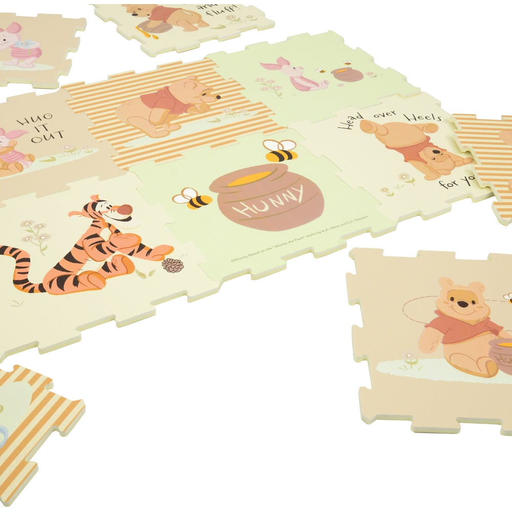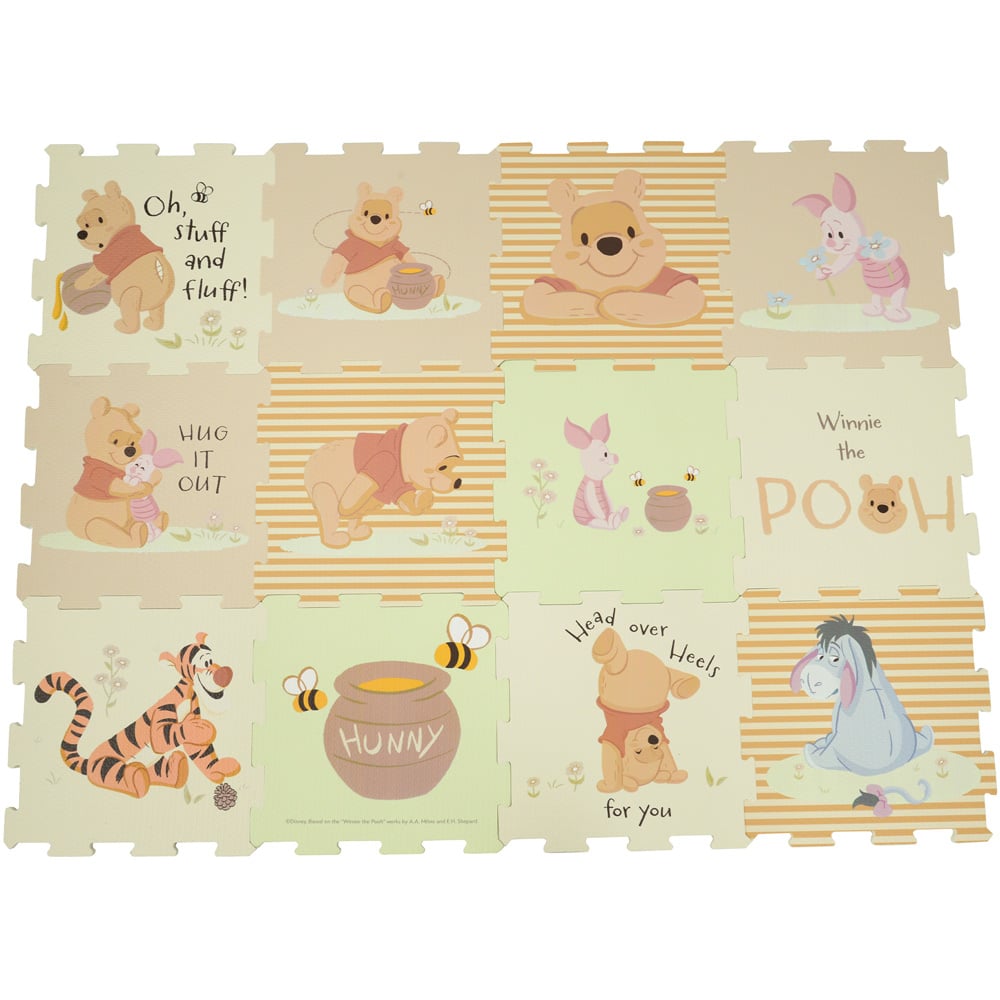 Introducing the 12-piece Winnie the Pooh play mat. With 12 interlocking pieces, set the mat up in the orientation you would like to make the perfect play space for your child. The soft EVA foam creates a safe, comfortable place for play both indoors and outdoors, allowing your little one to take a tumble while being protected from the hard floor. With visually engaging, fun graphics of Winnie the Pooh and his friends, they are sure to delight your child and encourage imaginative play. Each tile measures 30 x 30cm and can be connected to make a 120 x 90cm large play mat. So, piece together your new Winnie the Pooh play mat and let the fun begin.