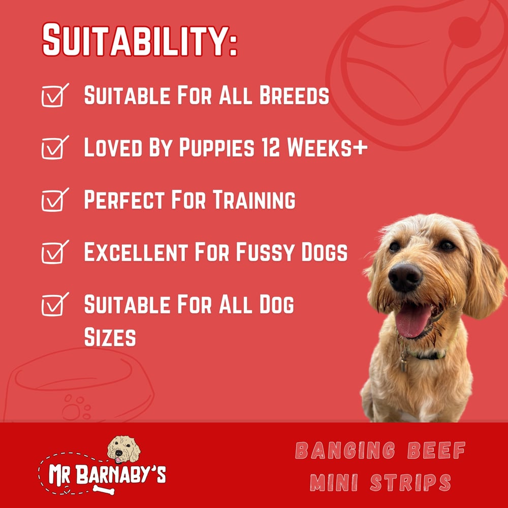 100% beef mini strips, gently air-dried to preserve their natural flavour, nutrients, and moisture. Soft, chewy, and packed with meaty goodness, they make ideal high-value rewards for training sessions or tasty snacks throughout the day. Suitable for puppies over 12 weeks old as well as adult dogs, these strips provide a protein-rich treat that supports both nutrition and mental stimulation. Mr Barnaby’s Banging Beef Mini Strips are grain free, hypoallergenic, and made from 100% natural ingredients, making them perfect for dogs with sensitive stomachs or specific dietary requirements. Each strip is carefully crafted, quality checked, and contains no added nasties, ensuring your furry friend enjoys wholesome, natural goodness while supporting their health, wellbeing, and happiness. Feeding Guidelines: Feed these complementary treats as part of your dog's daily food intake, to avoid weight gain. Serve at room temperature. Ensure your dog always has a bowl of fresh water nearby and is supervised when feeding. Due to the natural composition of these treats, there may be slight variations in shape, size, and colour. Prior to opening, store in a cool, dry place. Once opened, store in an air tight container, in a cool, dry place and use before the expiry date. Our grain-free treats are made in a facility that also manages grains, so slight traces may be present. Ingredients: 100% Pure Beef Analytical Constituents: Crude Protein 61.8% Crude Fat 24.6% Crude Ash 4.8% Crude Fibre 1.2%.