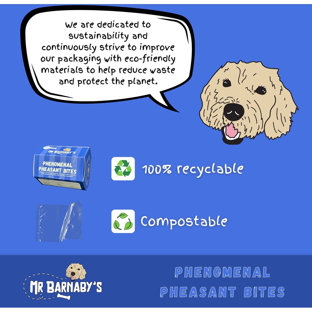 Natural pheasant bites, made from 100% pheasant and slowly air-dried to preserve their nutrients, flavour and natural moisture. Soft and chewy in texture, they are ideal for dogs that prefer an easier chew while still enjoying a protein-rich treat. Suitable for puppies over 12 weeks old as well as adult dogs, they can be given as a training reward or a tasty snack throughout the day. Mr Barnaby’s Phenomenal Pheasant Bites are grain free and hypoallergenic, making them a great choice for dogs with more sensitive diets. Naturally high in protein and full of flavour, they help to keep your pooch motivated during training while supporting their nutritional needs. Every bite is carefully made with no added nasties, so your dog enjoys only the best when it comes to their health, diet and lifestyle. Feeding Guidelines: Feed these complementary treats as part of your dog's daily food intake, to avoid weight gain. Serve at room temperature. Ensure your dog always has a bowl of fresh water nearby and is supervised when feeding. Due to the natural composition of these treats, there may be slight variations in shape, size, and colour. Prior to opening, store in a cool, dry place. Once opened, store in an air tight container, in a cool, dry place and use before the expiry date. Our grain-free treats are made in a facility that also manages grains, so slight traces may be present. Ingredients: 100% Pure Pheasant Analytical Constituents: Crude Protein 33.7% Crude Fat 27.4% Crude Ash 0.3% Moisture 18%.