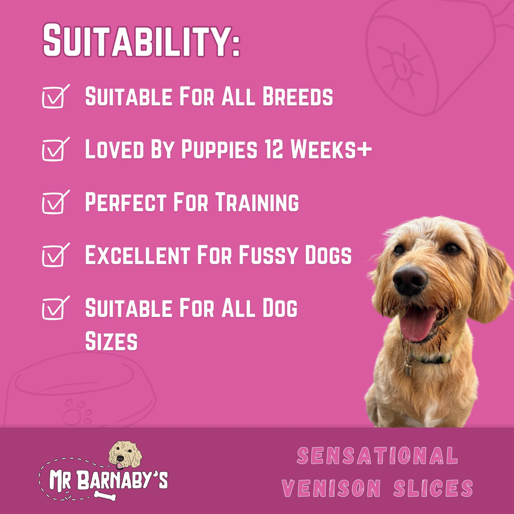 Wholesome venison slices, made from 100% real venison and gently air-dried to preserve nutrients, flavour and natural moisture. Soft and meaty, these slices are perfect as a training reward or a nutritious snack throughout the day. Suitable for puppies over 12 weeks old as well as adult dogs, they provide a high-protein, low-fat treat that supports both diet and mental stimulation. Mr Barnaby’s Sensational Venison Slices are grain free and hypoallergenic, making them ideal for dogs with sensitive stomachs or specific dietary needs. Packed with natural meaty flavour, they help keep your pooch engaged and satisfied while promoting overall wellbeing. Each slice is carefully prepared, quality checked, and contains no added nasties, ensuring your four-legged pal enjoys a natural, tasty treat every time. Feeding Guidelines: Feed these complementary treats as part of your dog's daily food intake, to avoid weight gain. Serve at room temperature. Ensure your dog always has a bowl of fresh water nearby and is supervised when feeding. Due to the natural composition of these treats, there may be slight variations in shape, size, and colour. Prior to opening, store in a cool, dry place. Once opened, store in an air tight container, in a cool, dry place and use before the expiry date. Our grain-free treats are made in a facility that also manages grains, so slight traces may be present. Ingredients: 100% Pure Venison Analytical Constituents: Crude Protein 80% Crude Fat 1% Crude Ash 2% Crude Fibre 10% Moisture 15%.