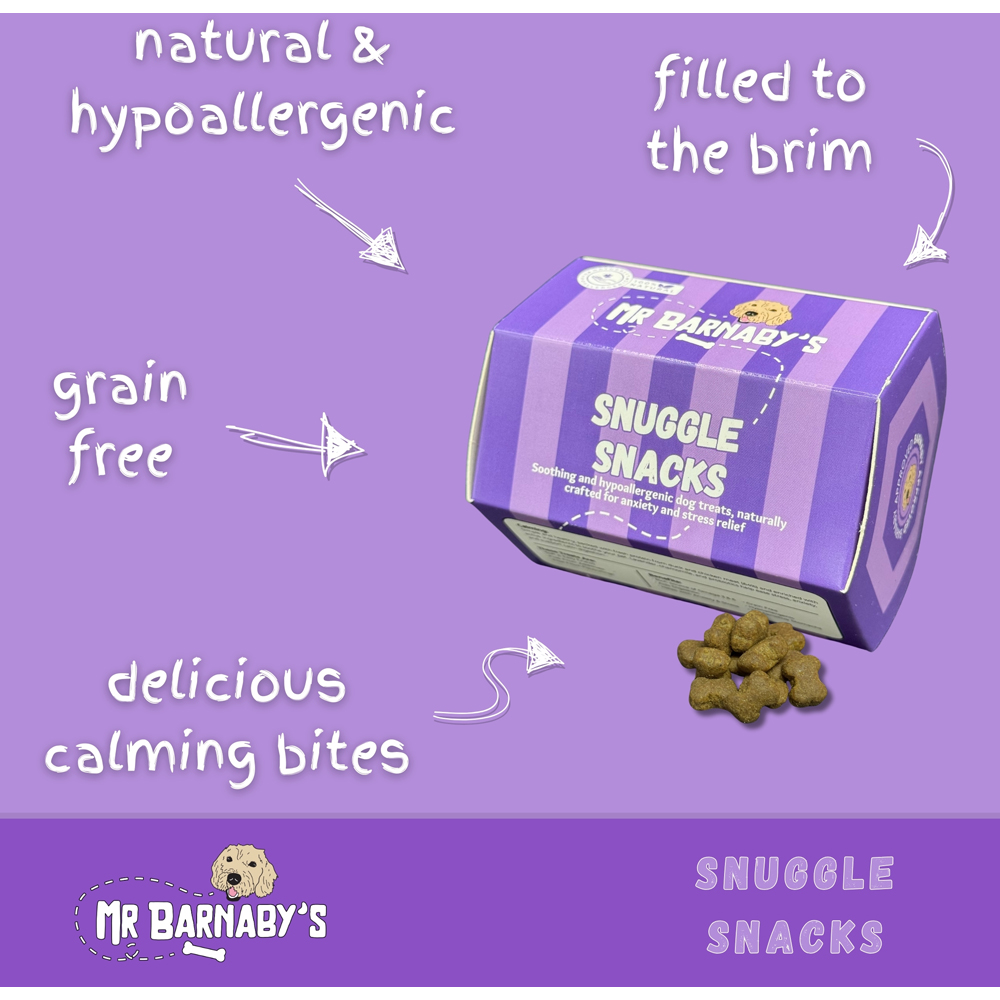Bite-size calming training treats, made with natural ingredients, these tasty snacks are ideal for helping your dog settle before bedtime or to keep them calm during the day. They can provide support during times of stress such as separation anxiety, loud noises like fireworks, or any moment when your pooch feels unsettled. Suitable for puppies over 12 weeks old as well as adult dogs, they make a gentle and reassuring addition to a daily routine, without causing any drowsiness. Mr Barnaby’s Snuggle Snacks are rich in omega 3 and 6 and are gentle on sensitive stomachs. Grain free and hypoallergenic, they are carefully crafted for dogs with more delicate dietary needs. Every ingredient is thoughtfully selected and prepared with no added nasties, ensuring your pooch enjoys a natural, calming treat that supports both their wellbeing and peace of mind. Feeding Guidelines: Feed these complementary treats as part of your dog's daily food intake, to avoid weight gain. Serve at room temperature. Ensure your dog always has a bowl of fresh water nearby and is supervised when feeding. Due to the natural composition of these treats, there may be slight variations in shape, size, and colour. Prior to opening, store in a cool, dry place. Once opened, store in an air tight container, in a cool, dry place and use before the expiry date. Our grain-free treats are made in a facility that also manages grains, so slight traces may be present. Ingredients: Freshly Prepared Duck 40%, Freshly Prepared Chicken 24%, Sweet Potato 13%, Potato, Peas, Vegetable Protein, Minerals, Chicken Gravy 1%, Nucleotides 1%, Cellulose, Omega 3 Supplement, Fructooligosaccharides(FOC) Beta Glucans, Mannanolgosaccharides(MOS, 1,201 mg/kg) Chamomile (50mg/kg, Lavender (50mg/kg) Analytical Constituents: Crude Protein 25% Crude Fat 16% Crude Fibre 4.5% Crude Ash 7.5% Omega 6 2% Omega 3 0.9% Moisture 7.5% NFE 39% Metabolisable – Energy 371kcal/100g.