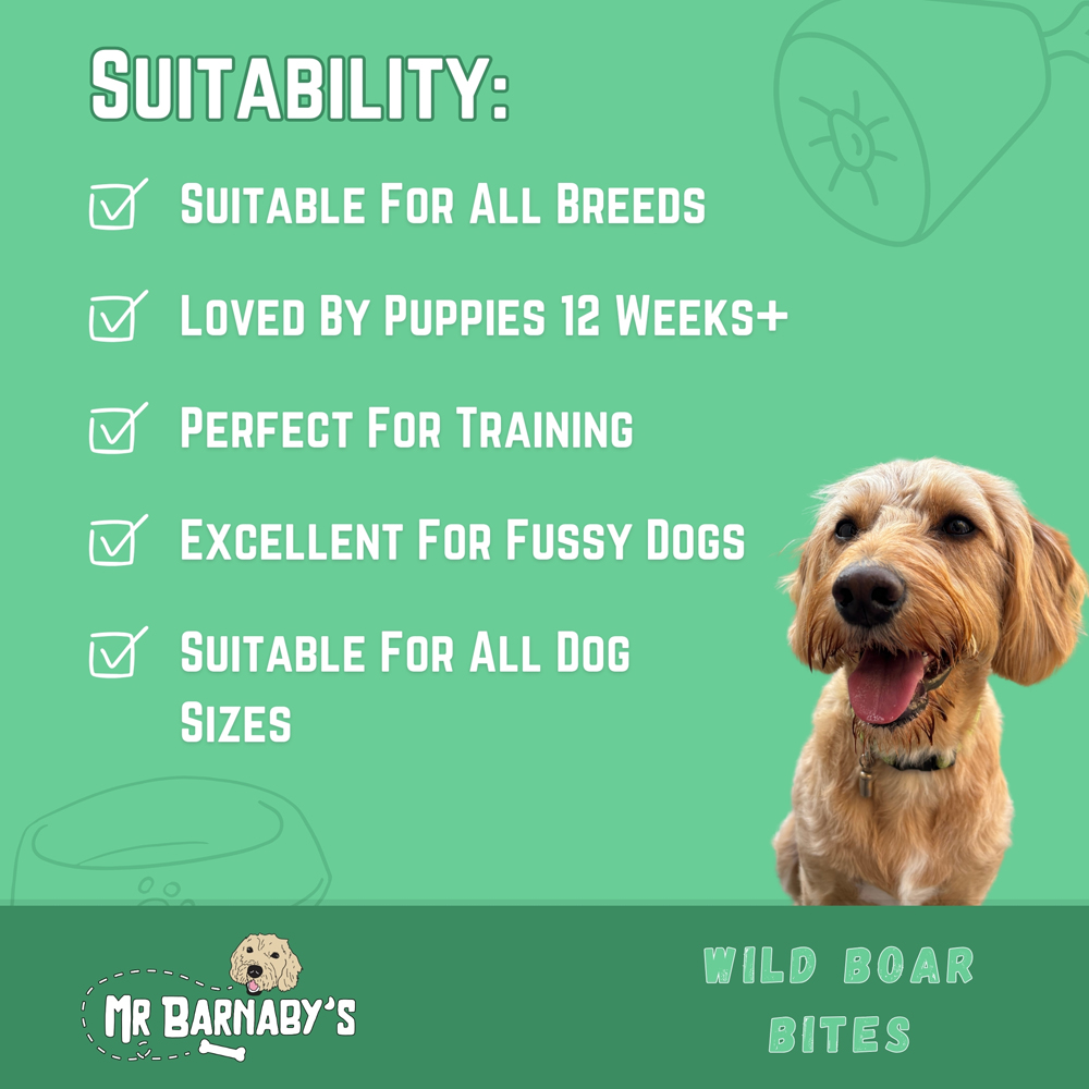 Bite-size meaty treats, made from 100% wild boar and gently air-dried to retain their nutrients, flavour and natural moisture. These softer, chewy bites are ideal for dogs that prefer an easier chew while still enjoying a rich source of protein. Suitable for puppies over 12 weeks old as well as adult dogs, they are perfect for rewarding good behaviour or offering as a small, tasty snack. Mr Barnaby’s Wild Boar Bites are grain free and hypoallergenic, making them an excellent choice for dogs with more sensitive diets. Naturally full of flavour, they fit seamlessly into training routines, helping to keep your dog motivated and mentally stimulated. Every bite is carefully prepared with no added nasties, ensuring your four-legged friend enjoys a natural treat that supports their health, diet and lifestyle. Feeding Guidelines: Feed these complementary treats as part of your dog's daily food intake, to avoid weight gain. Serve at room temperature. Ensure your dog always has a bowl of fresh water nearby and is supervised when feeding. Due to the natural composition of these treats, there may be slight variations in shape, size, and colour. Prior to opening, store in a cool, dry place. Once opened, store in an air tight container, in a cool, dry place and use before the expiry date. Our grain-free treats are made in a facility that also manages grains, so slight traces may be present. Ingredients: 100% Pure Wild Boar Analytical Constituents: Crude Protein 59.8% Crude Fat 12.1% Crude Ash 9.6% Crude Fibre 16.8%.
