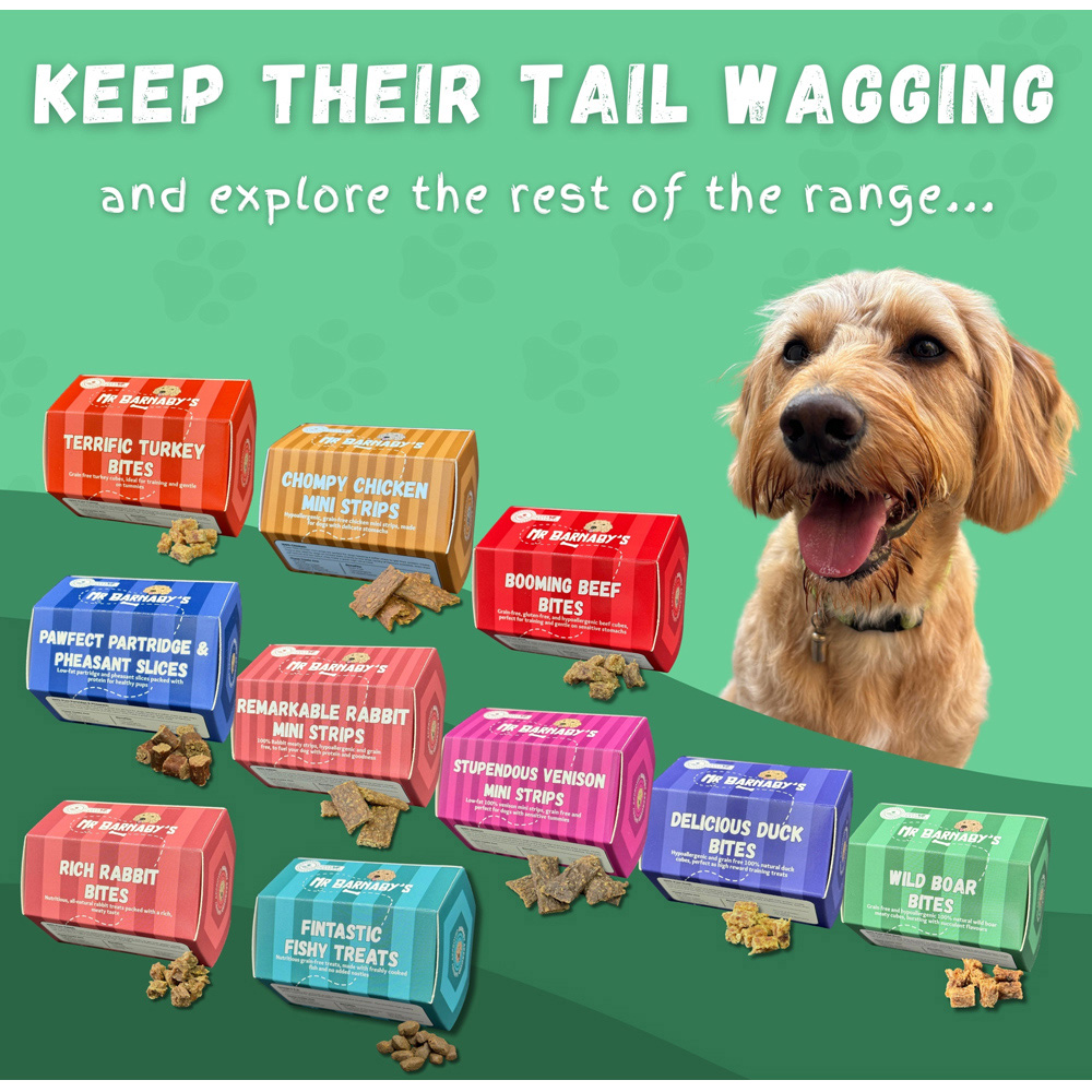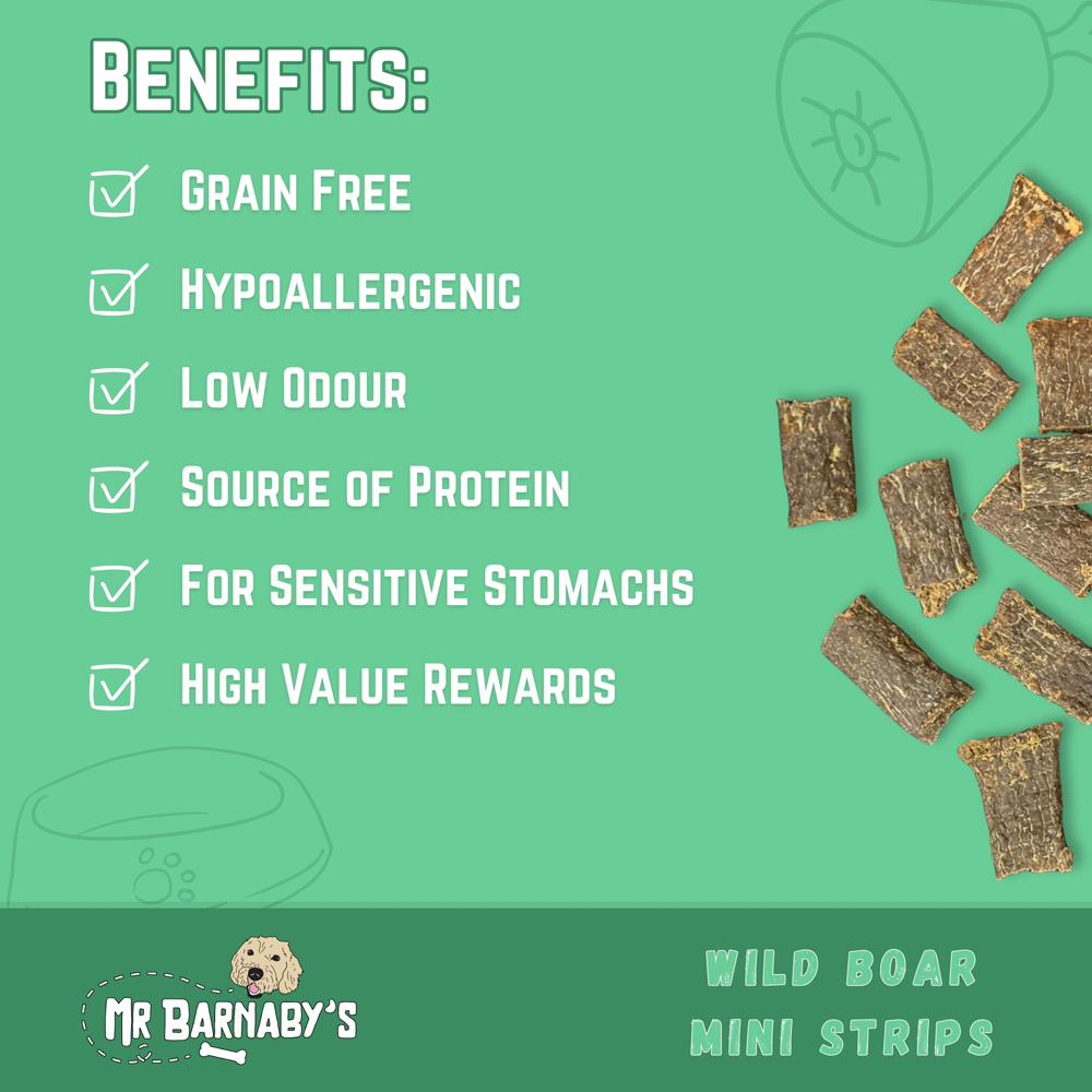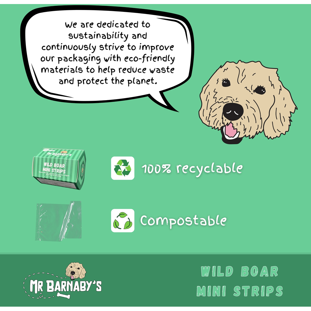 100% wild boar mini strips, gently air-dried to retain their nutrients, natural flavour and moisture. With a soft and chewy texture, these meaty strips are perfect for rewarding your dog during the day or offering as a tasty snack between meals. Suitable for puppies over 12 weeks old as well as adult dogs, they provide a protein-rich addition to a healthy daily routine. Mr Barnaby’s Wild Boar Mini Strips are grain free and hypoallergenic, making them an excellent choice for dogs with sensitive diets. Packed with natural flavour and carefully prepared with no added nasties, every strip is thoroughly checked to ensure your four-legged friend enjoys only the best in taste, quality and nutrition. Feeding Guidelines: Feed these complementary treats as part of your dog's daily food intake, to avoid weight gain. Serve at room temperature. Ensure your dog always has a bowl of fresh water nearby and is supervised when feeding. Due to the natural composition of these treats, there may be slight variations in shape, size, and colour. Prior to opening, store in a cool, dry place. Once opened, store in an air tight container, in a cool, dry place and use before the expiry date. Our grain-free treats are made in a facility that also manages grains, so slight traces may be present. Ingredients: 100% Pure Wild Boar Analytical Constituents: Crude Protein 59.8% Crude Fat 12.1% Crude Ash 9.6% Crude Fibre 16.8%.