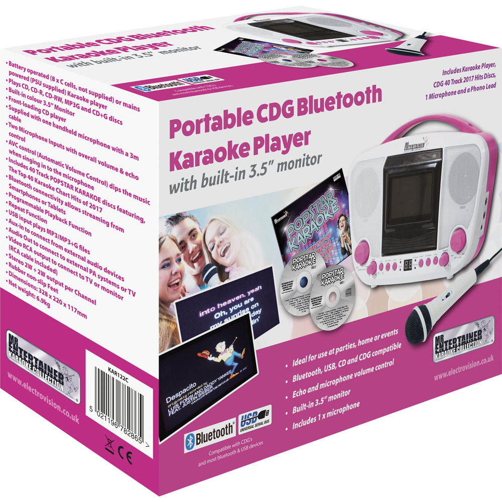 Enjoy friends and family get together with this Mr Entertainer Pink and White Portable CDG Bluetooth Karaoke Player. With its battery-operated front-loading design, you can use it virtually anywhere without the need for a TV. Just plug in the supplied microphone, insert one of the included chart hits CDG discs and you're ready to sing along to the lyrics displayed on the 3.5-inch TFT colour display. If you don't want to use it as a portable device, you can connect the karaoke player to a TV set, monitor or projector using the mains power adaptor supplied. The machine also has handy rubber and non-slip feet and you can connect the audio to a more powerful Hi-Fi system or PA amplifier for that stadium feel. In addition, the karaoke player can stream songs from smartphones or tablets via Bluetooth - you can connect external audio sources via the AUX connector and through the USB port, making it a truly universal player. It can play CD, CD-R, CD-RW, MP3G and CD+G discs and comes with a 40 Track Popstar Karaoke hits disc.