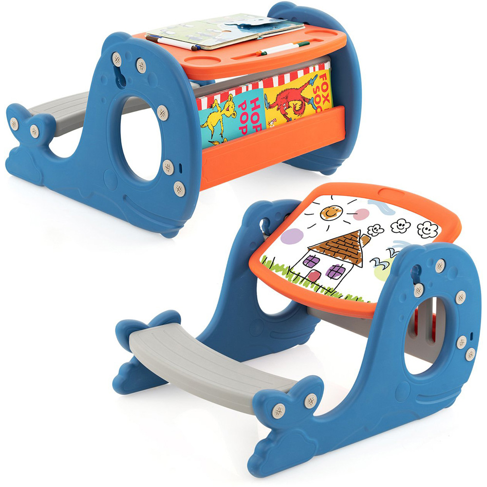 Dive into a world of creativity and convenience with the Costway Kids Blue Multi Functional Convertible Activity Table Set. This multi-functional table set is not just any ordinary furniture; it's a study table, a dining table, a drawing board, and a storage space all rolled into one. With its double-sided tabletop featuring a normal table and an angle-adjustable whiteboard, your child can switch from reading and writing to drawing without missing a beat. The thoughtful design includes a cup holder, a pen slot, and a book stand, ensuring everything your child needs is within easy reach. Certified by UKCA for safety, this table set, with its smooth, burr-free surface, is ideal for toddlers aged one and up, making it a fantastic addition to any children's room, playroom, or nursery.
