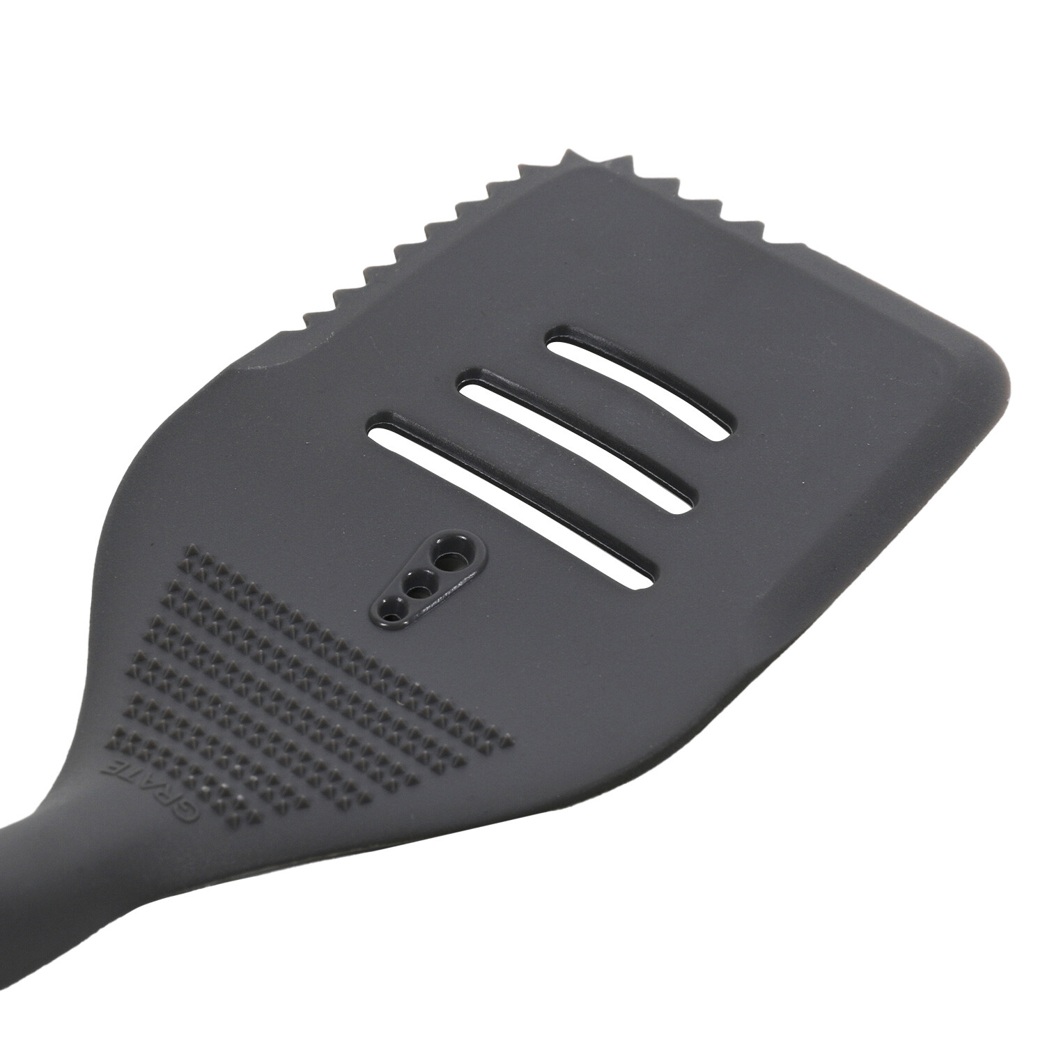 The Multi-Use Slotted Turner is the perfect tool for any busy kitchen. This turner can be used for both cooking and serving and features multiple extra elements to make cooking easier. It has a built-in serrated scrapper and cutter, a herb stripper, and grinder so you need fewer kitchen tools. The turner is finished with a hanging hole in the handle for easy storage.
