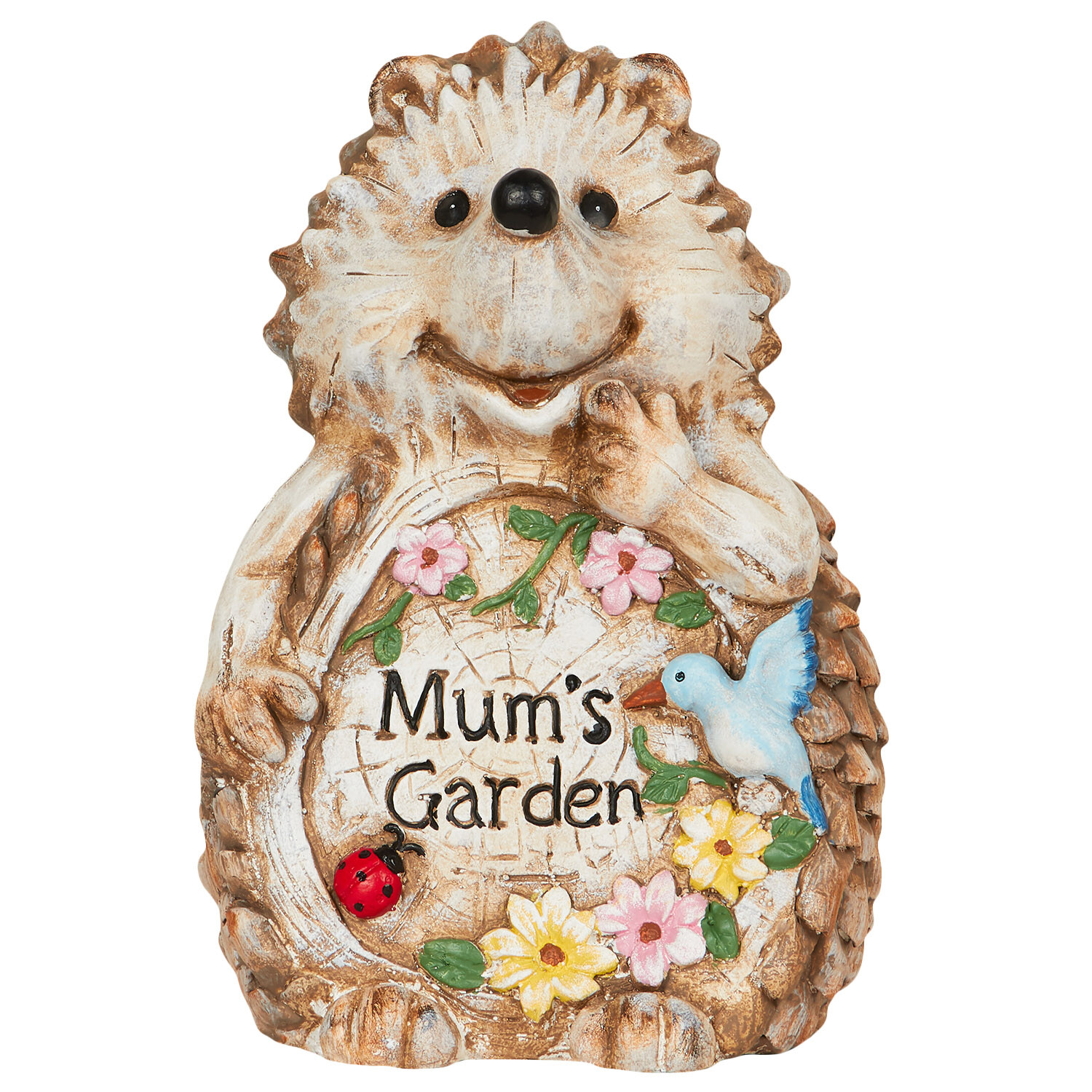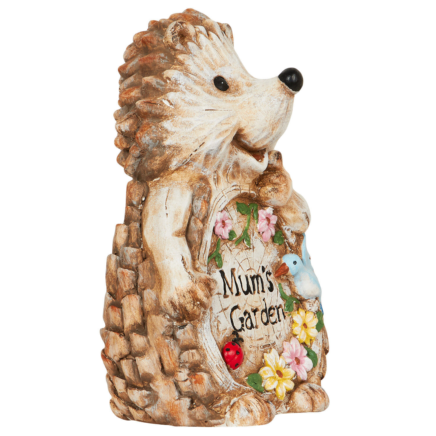 Add charm to your outdoors with this Mums Garden Hedgehog. This stunning decor piece features a lifelike hedgehog design and a lovely 'Mums Garden' message surrounded by flowers, bird and insect motifs that truly represent a garden space. Suitable for outdoor use, this hedgehog makes an ideal gift for Mother's Day or garden enthusiasts.