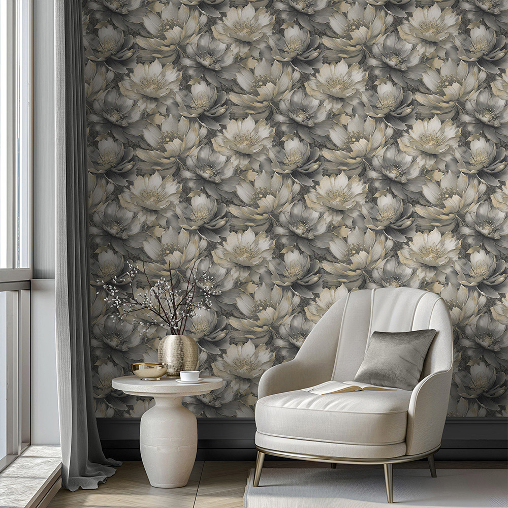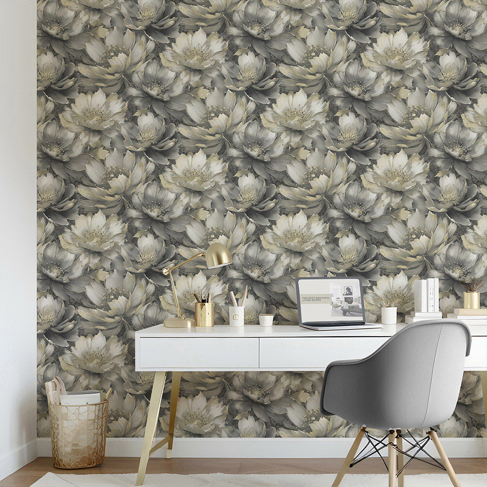 Muriva Aminah Floral Charcoal and Gold Wallpaper