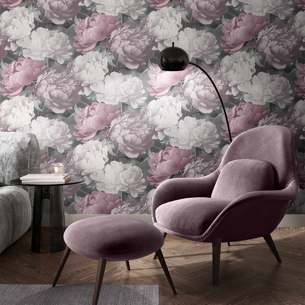 Add instant charm to your space with this Muriva Doretta Floral Pink Wallpaper. Delicate and beautiful large peonies are the star of the show in the all over floral print. Created on a canvas effect texture gives this design a luxury feel and is perfect for any living areas, bedrooms and halls.