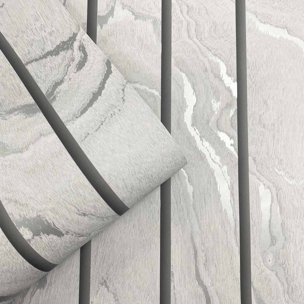 Uplift the decor of any room with Muriva Woodgrain Panel Silver Wallpaper. The wallpaper features a modern wood effect design. Wood effects are a strong design style for any interior. Woodgrain Panel is a bold, flowing, and detailed wooden design created to give a mural effect when on a wall. Natural colours and touches of metallic ink flow through the design. This high-quality wallpaper has a metallic finish and is wipeable. It is suitable for the bedroom and living room. The wallpaper is easy to hang. Hanging instructions are provided on the back of the label. Application: Paste the Paper. Design Match: Offset. Design Repeat: 64cm, Roll Length: 10.05m, Roll Width: 53cm.