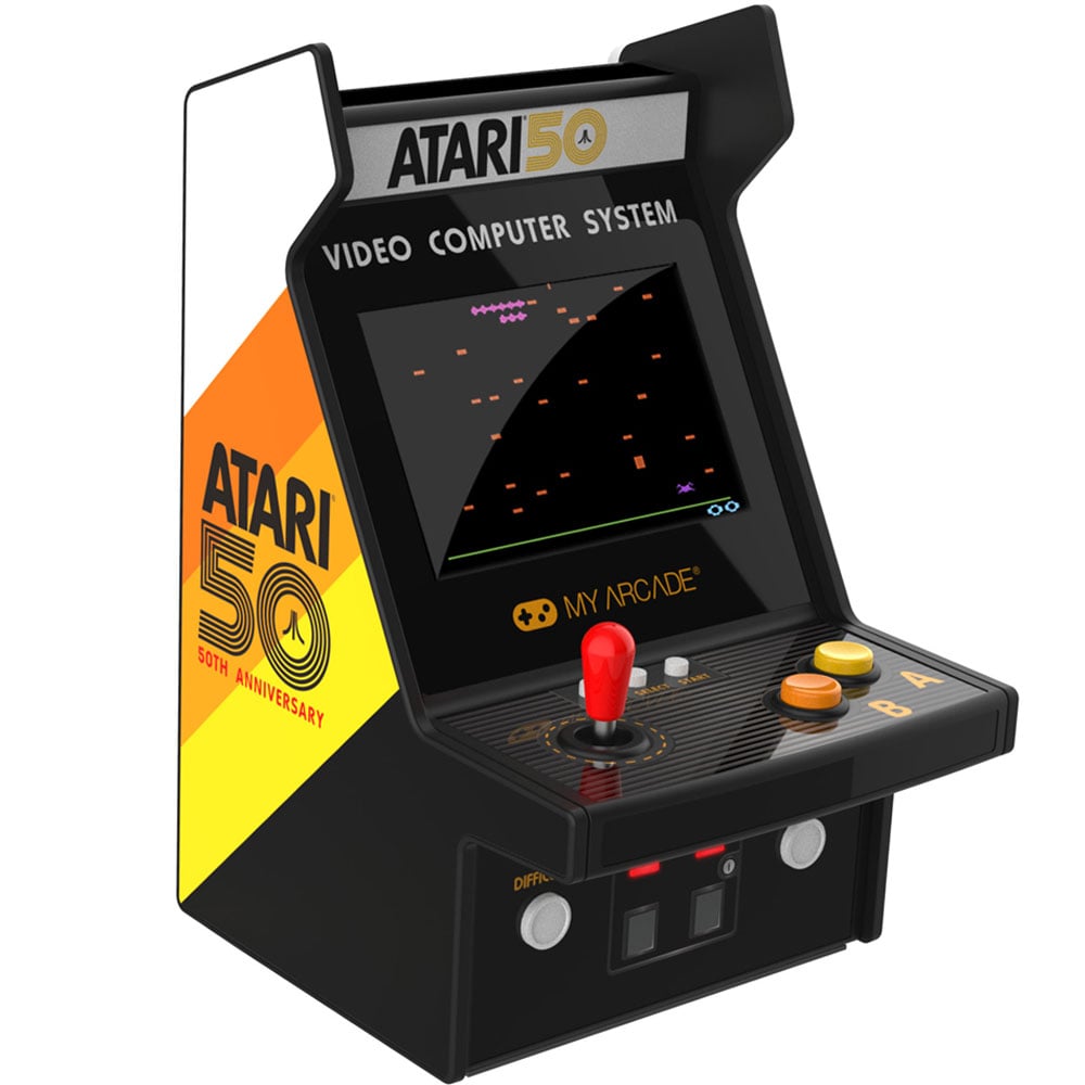 Celebrate the golden age of gaming with the My Arcade 100 Game Atari Retro Micro Player Gaming System, featuring 100 built-in Atari 2600 titles, including timeless classics like PONG, Asteroids, and Breakout. This officially licensed arcade cabinet offers a fully playable experience, making it a must-have for any Atari fan. Compact and portable, it's perfect for relieving your favourite games from the past.