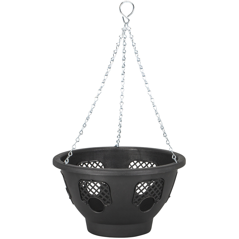 Upgrade the elegance of your front porch or garden with the My Garden Black Metal Plastic Easy Blooming Basket. Create splendid floral displays without the fuss using this 30cm basket with a three-way chain. This hanging basket features removable panels to make side planting easier.