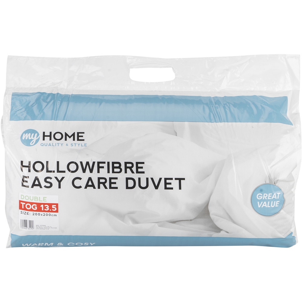 This cosy My Home 13.5 Tog Duvet will keep you warm and comfortable on those frosty nights. Its thick hollowfibre filling traps in heat, offering you a snuggly and serene sleep, and is machine washable for use night after night.