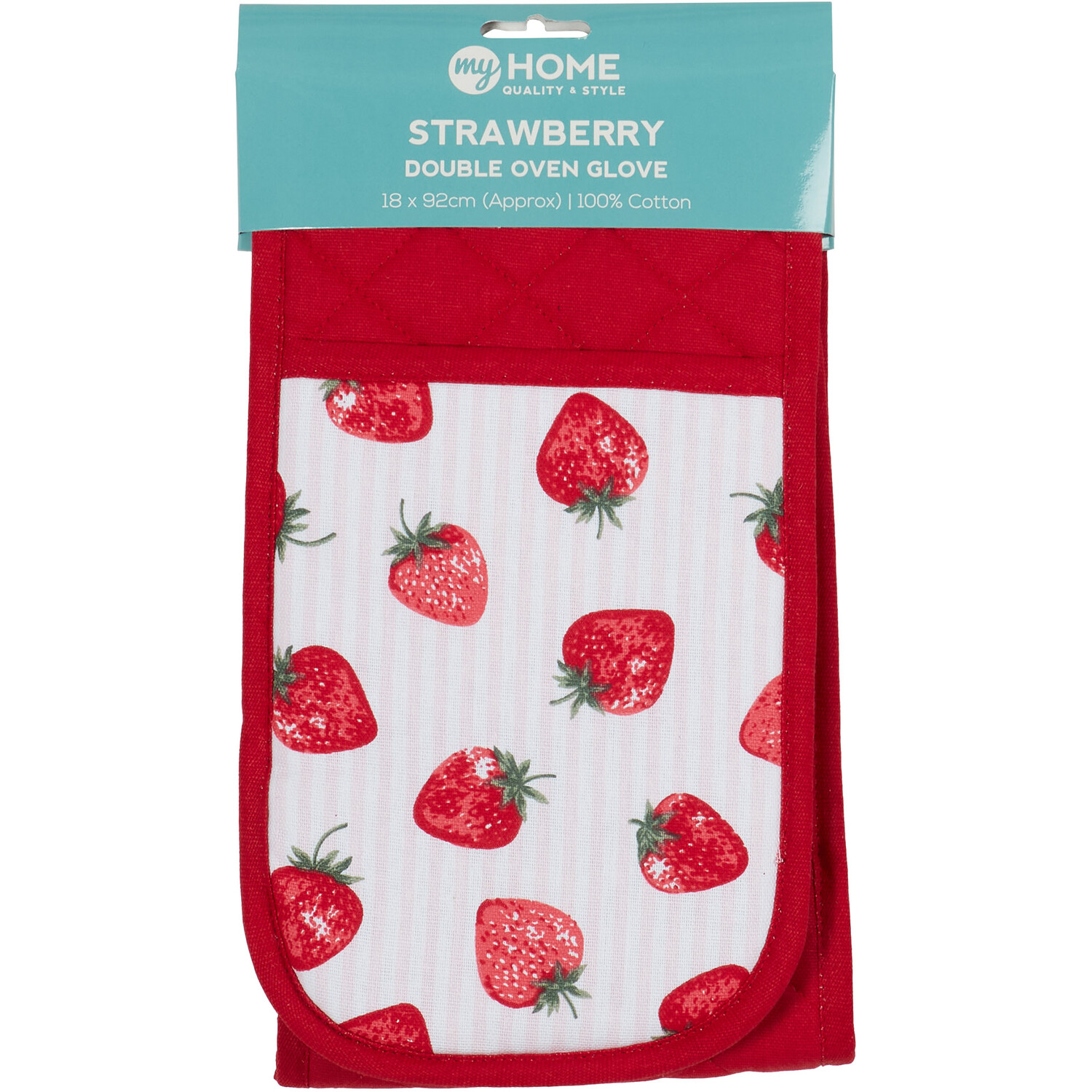 Add a touch of fun and colour to your kitchen with the help of our adorable Strawberry Double Oven Glove. This set of oven gloves has a bright red tone and is finished with a cute strawberry pattern to help you raise a smile every time you use them! They're perfect for protecting your hands from burns when taking hot dishes out of the oven and come complete with a hanging loop for simple storage when not in use.