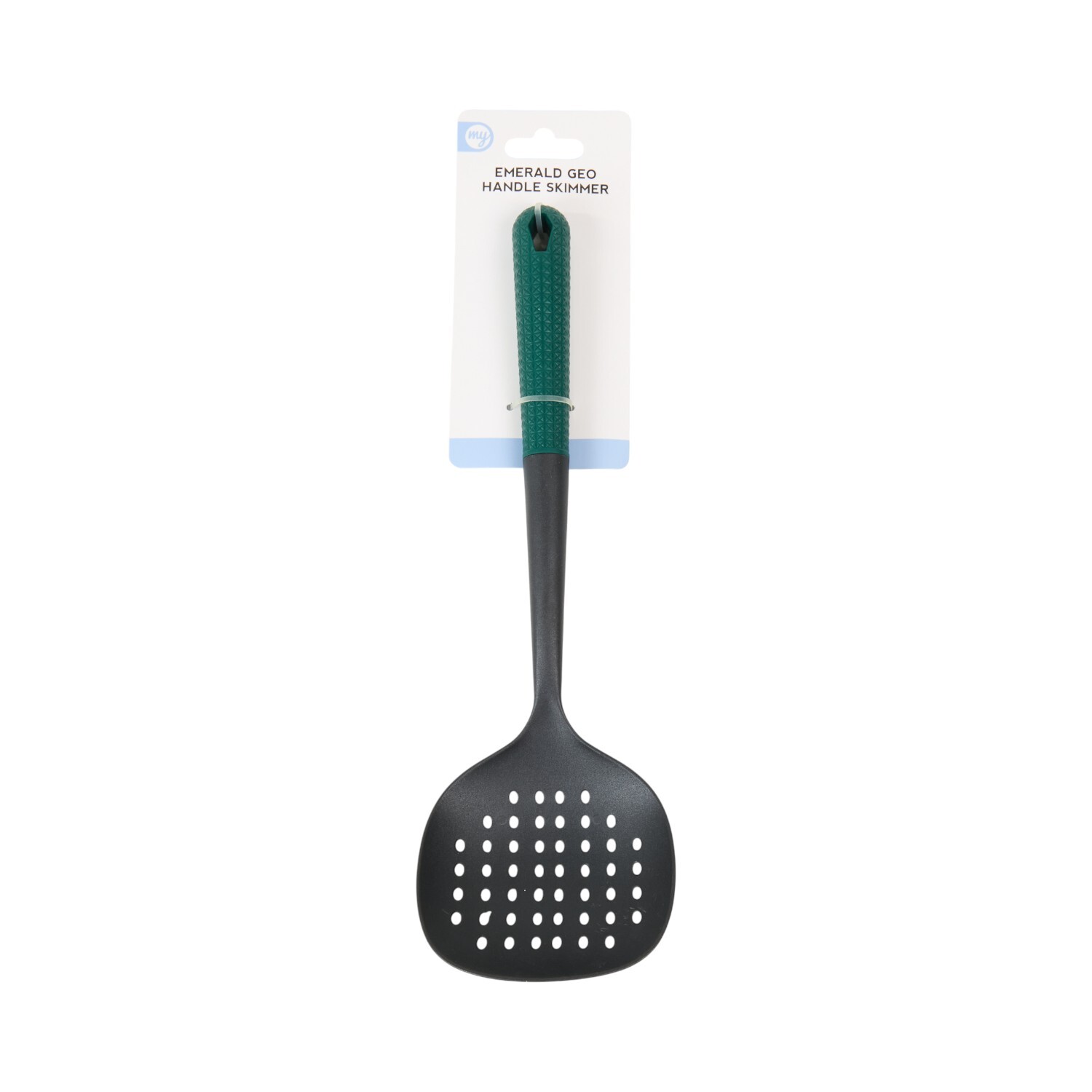 Ensure easy frying with this My Kitchen Emerald Geo Handle Skimmer. Featuring a stylish and ergonomic green handle, it makes a charming and functional addition to any kitchen area. The holes in the skimmer drain excess oil, leaving you with crisp and tasty fried dishes.