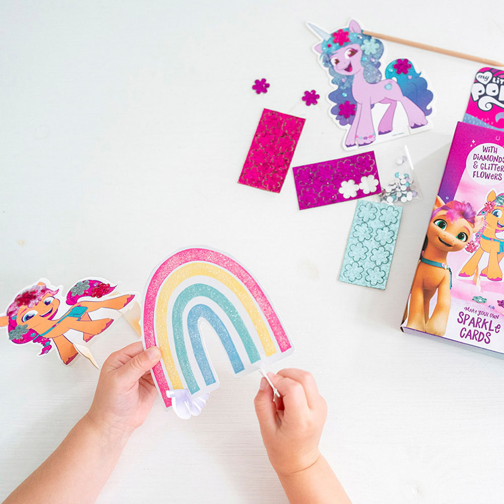 Create your own favourite My Little Pony with this My Little Diamond Painting Kit. Choose one of the character cards and decorate with a selection of the included rhinestones then display them on the included stands. This licensed kit also includes a tray for the rhinestones and a tool for applying the rhinestones. Suitable for ages four years and above.