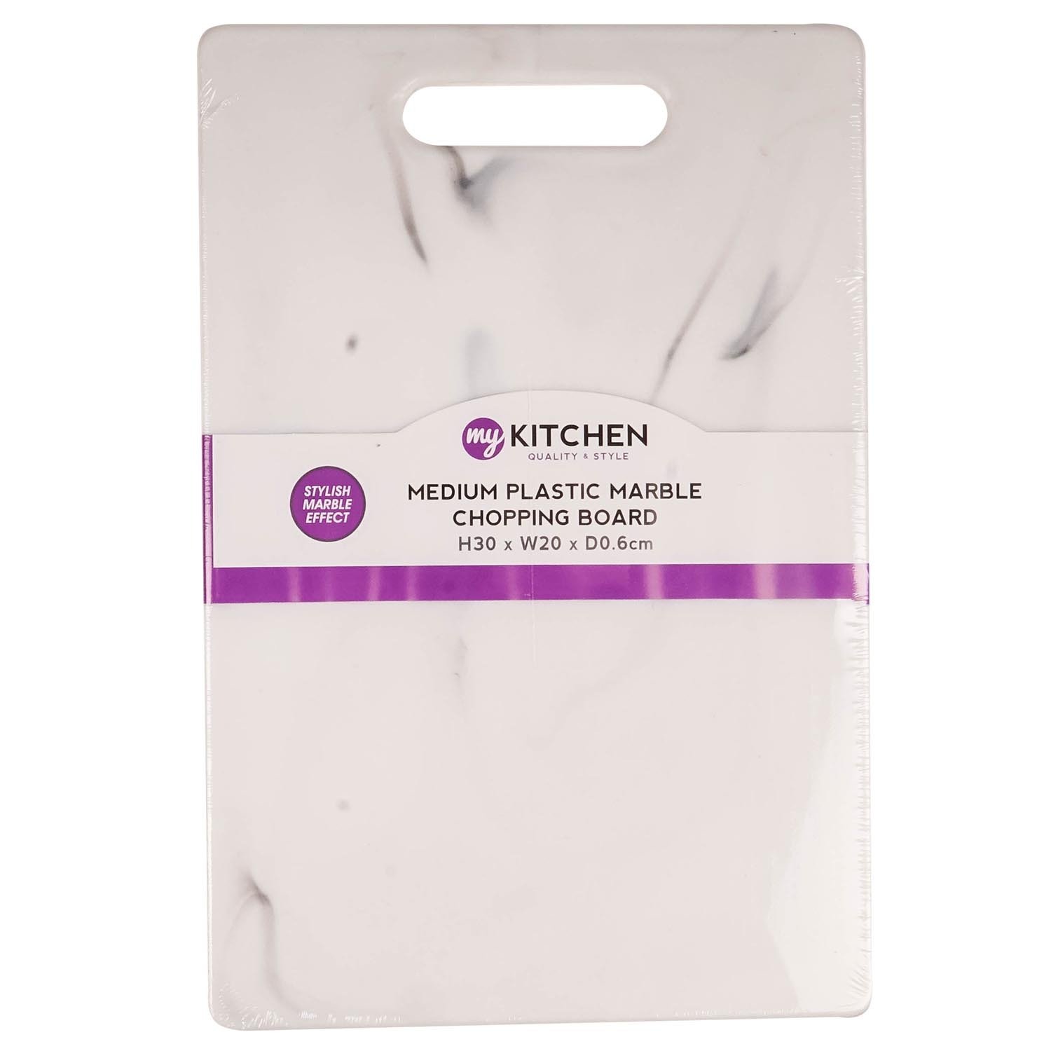 Chop, dice, cut and slice in style with the gorgeous Plastic Marble Chopping Board. Featuring a contemporary marble effect surface and helpful handle, this plastic chopping board will make a trendy addition to your kitchen surface.