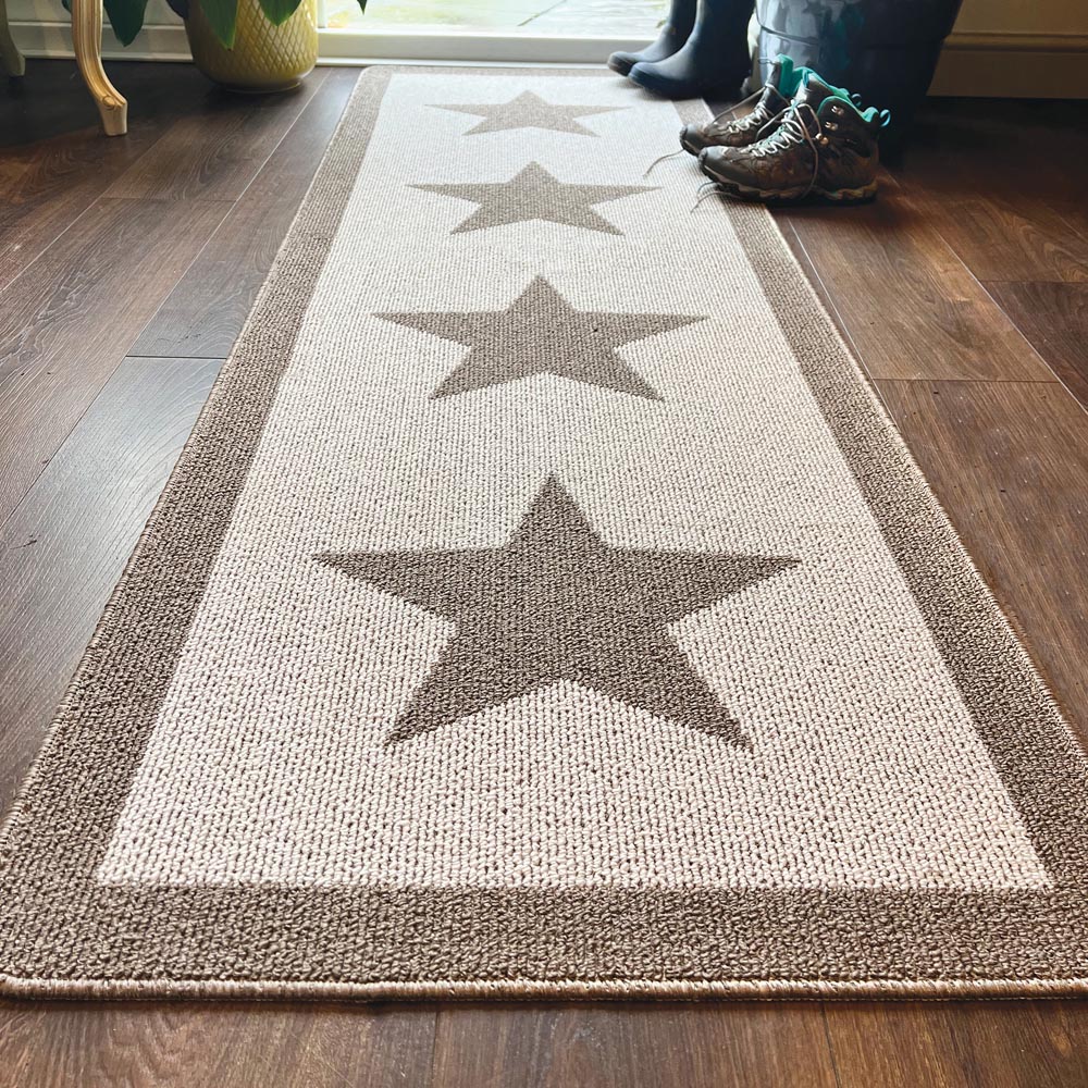 The Stain Resistant Star runner is the ideal, practical mat for any doorway, kitchen, and utility room. It features three stone stars, on a white background with a thick stone border around the edge of the mat. British made to be long lasting, ultra-absorbent and washable with a non-slip backing, add this stain resistant runner to your space to protect your floors and add some extra style and comfort to your home. Care and Use: Machine washable at 30 degrees. Hang or lie flat to dry. Tumble drying not recommended.