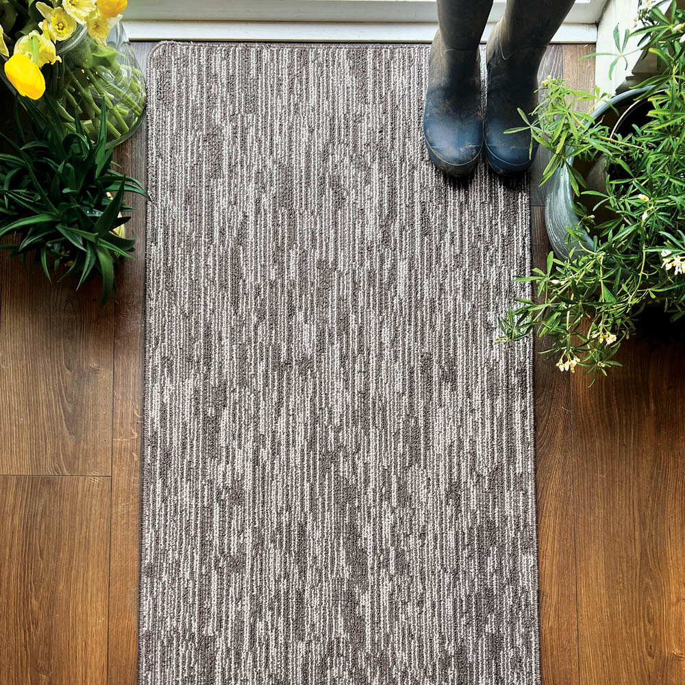 The Stain Resistant Broken Stripe runner is the ideal, practical mat for any doorway, kitchen, and utility room. It features a broken stripe design in white and silver, creating a very contemporary look to go with any interior style. British made to be long lasting, ultra-absorbent and washable with a non-slip backing, add a Stain Resistant runner to your space to protect your floors and add some extra style and comfort to your home. Available in a range of colours. Machine washable at 30 degrees. Hang or lie flat to dry. Tumble drying not recommended. The