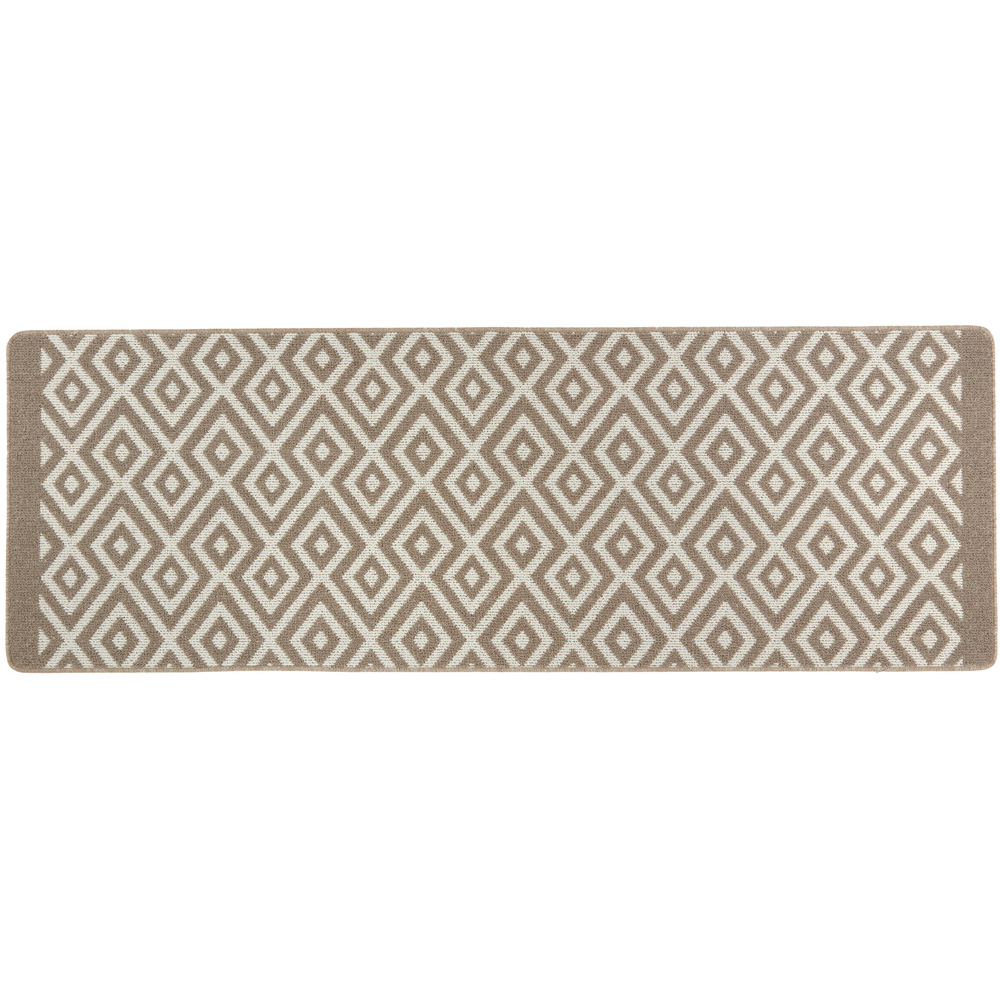 The Geo Stain Resistant Cosy runner is the ideal, practical mat for any doorway, kitchen, and utility room. This has a stone and white geometric design, and has and a stone border on each end creating a very contemporary look to go with any interior style. British made to be long lasting, ultra-absorbent and washable with a non-slip backing, add a Stain Resistant runner to your space to protect your floors and add some extra style and comfort to your home. Available in a range of colours. Machine washable at 30 degrees. Hang or lie flat to dry. Tumble drying not recommended.