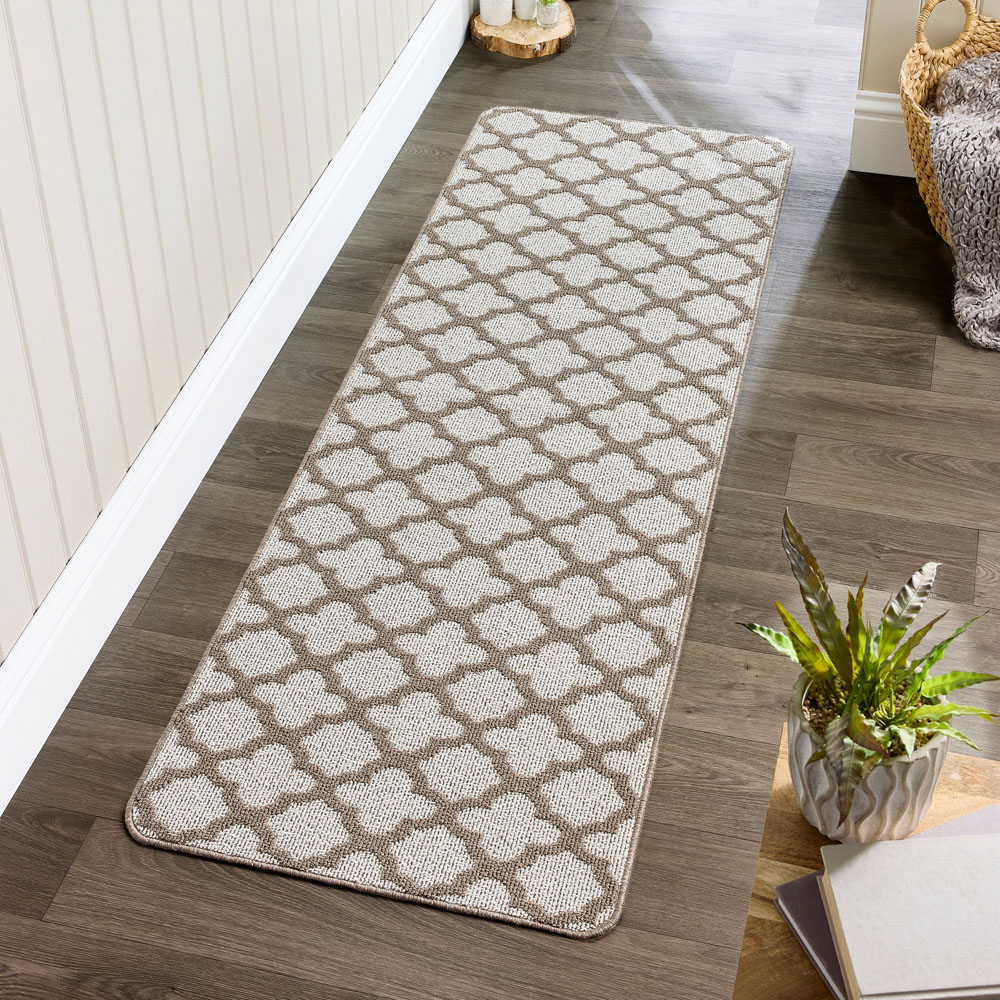 The Stain Resistant Moroccan Tile runner is the ideal, practical mat for any doorway, kitchen, and utility room. It features a repeat Moroccan style pattern in stone on an ivory background. British made to be long lasting, ultra-absorbent and washable with a non-slip backing, add this stain resistant mat to your space to protect your floors and add some extra style and comfort to your home. Available in Stone, Silver and Charcoal colours. Care and Use: Machine washable at 30 degrees. Hang or lie flat to dry. Tumble drying not recommended.