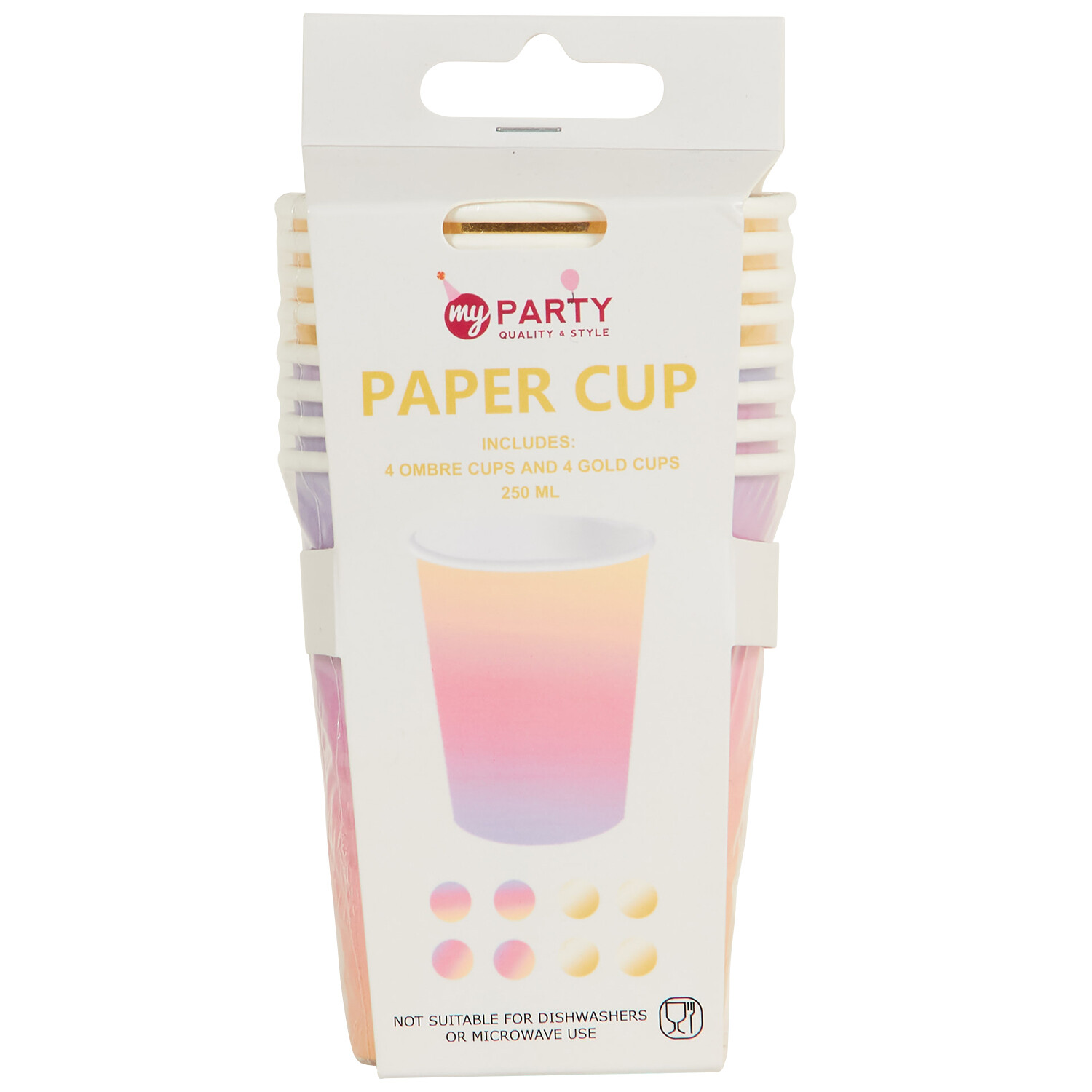 This My Party Pack of 8 Cups contains four pastel ombre designs and four gold foil for a dazzling finish. Perfect for any celebration, they help to keep your guests hydrated while minimising the washing up.
