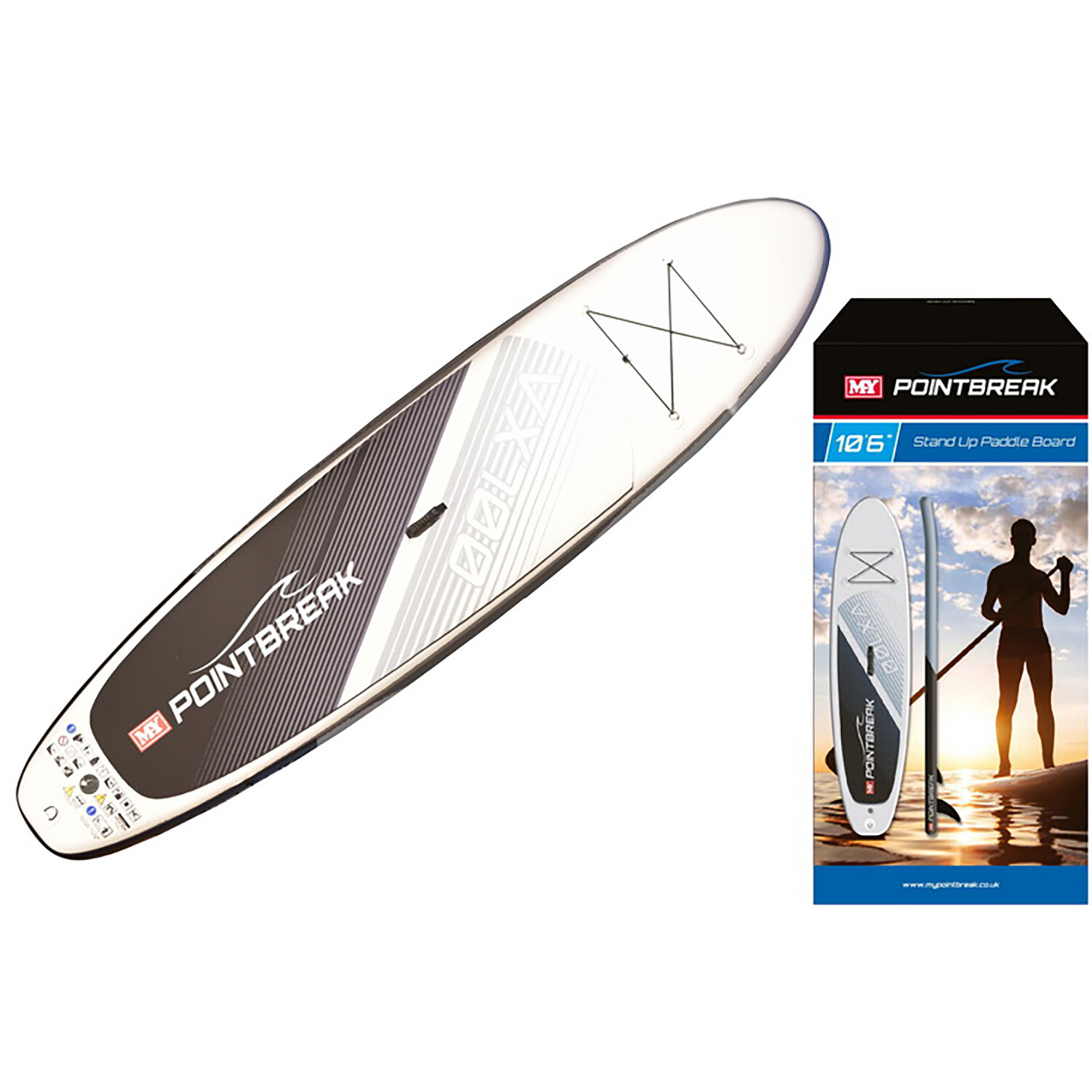 Perfect for those that love the water, the M.Y Pointbreak Stand Up Paddleboard 10'6" is great for beginners or intermediate learners to try out this fun water sport. With a single action hand pump with a pressure gauge included, this paddleboard can be inflated in less than 10 minutes, making setup and pack-away easy. Efficiently make repairs and swift adjustments with the repair kit in a waterproof container and valve wrench included. The 3-shaft aluminium paddle can be easily adjusted to suit your height, with a single blade that will elegantly cut through the water. With a slot in the centre fin to help keep you on track and stay balanced. For easy storage and transportation, you can pack up all your equipment in a durable and comfortable travel backpack, perfect for last-minute trips. The handy leash will make sure you're never too far from this gorgeous board featuring a simple yet stylish black and white design.