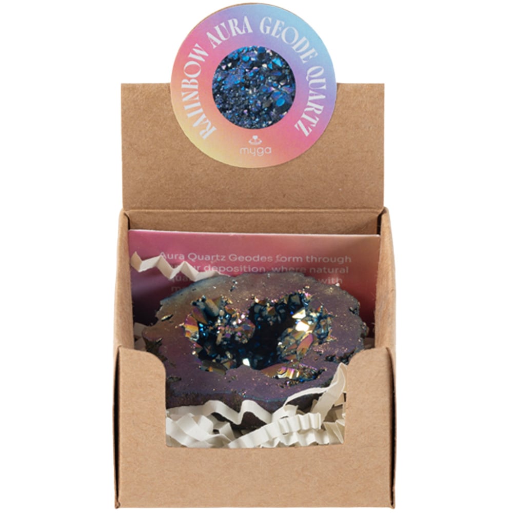 Experience the calming power of the Myga Aura Rainbow Quartz Crystal Geode, a natural gemstone mineral rock ornament designed to aid in meditation, yoga, Reiki, and chakra healing. This stunning geode promotes balance, positivity, and energy alignment, making it the perfect addition to your wellness practice or home décor.