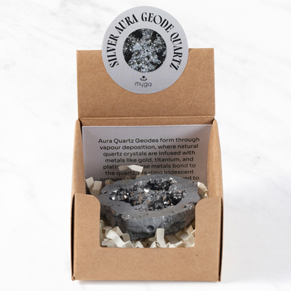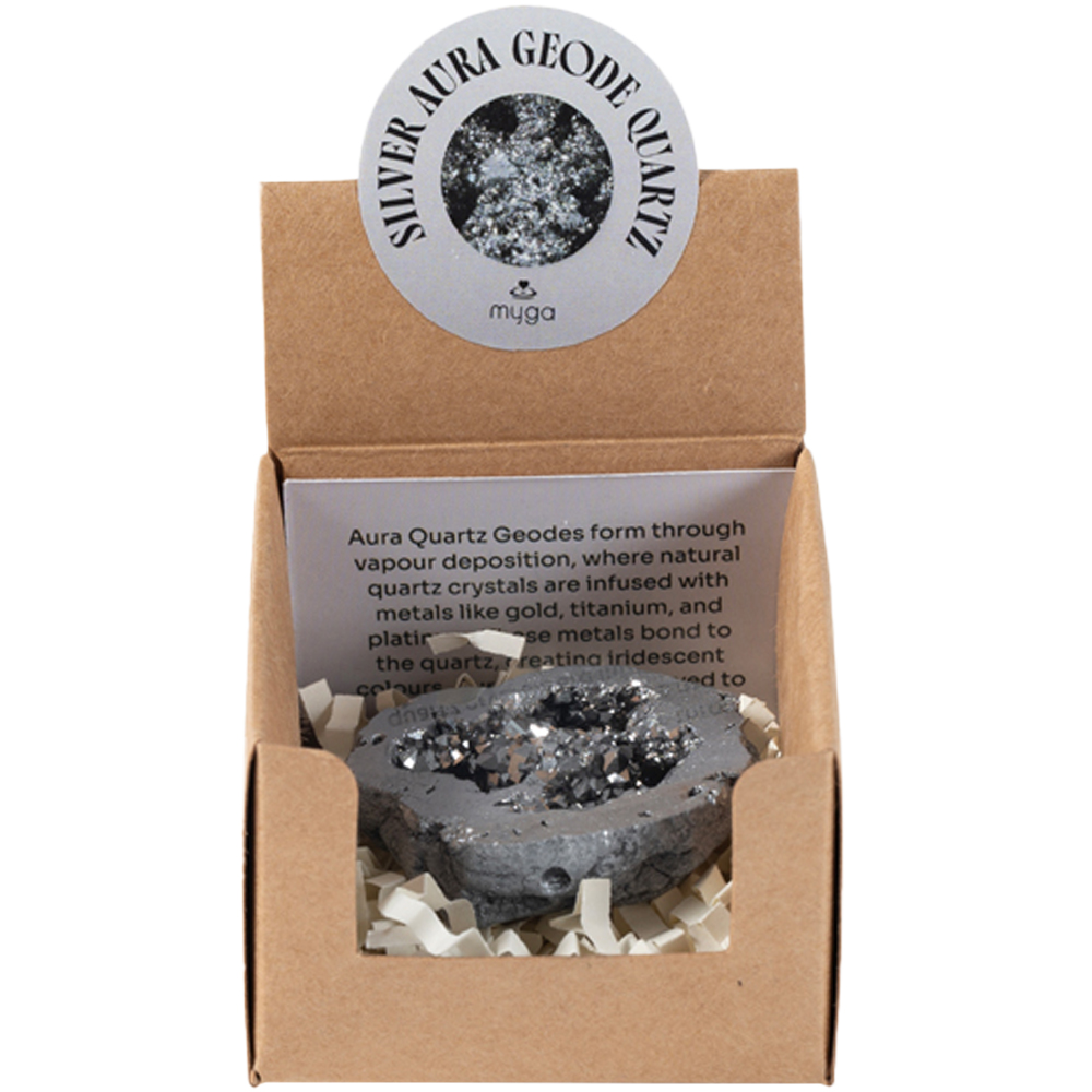 Experience the calming power of the Myga Aura Silver Quartz Crystal Geode, a natural gemstone mineral rock ornament designed to aid in meditation, yoga, Reiki, and chakra healing. This stunning geode promotes balance, positivity, and energy alignment, making it the perfect addition to your wellness practice or home décor.
