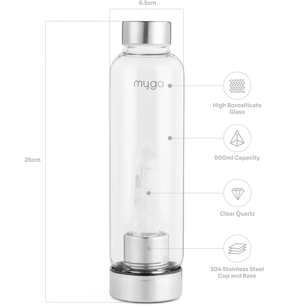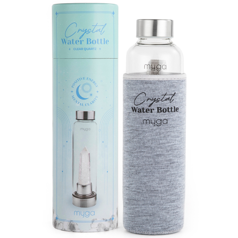 The Myga Clear Quartz Crystal Water Bottle combines the power of natural Clear Quartz with a 500ml glass bottle to promote wellness and self-care. Known as the "Master Healer," Clear Quartz is believed to amplify energy, enhance clarity, and balance your body and mind. The sleek design, paired with a neoprene sleeve, ensures it’s perfect for daily use and protection while you're on the go.
