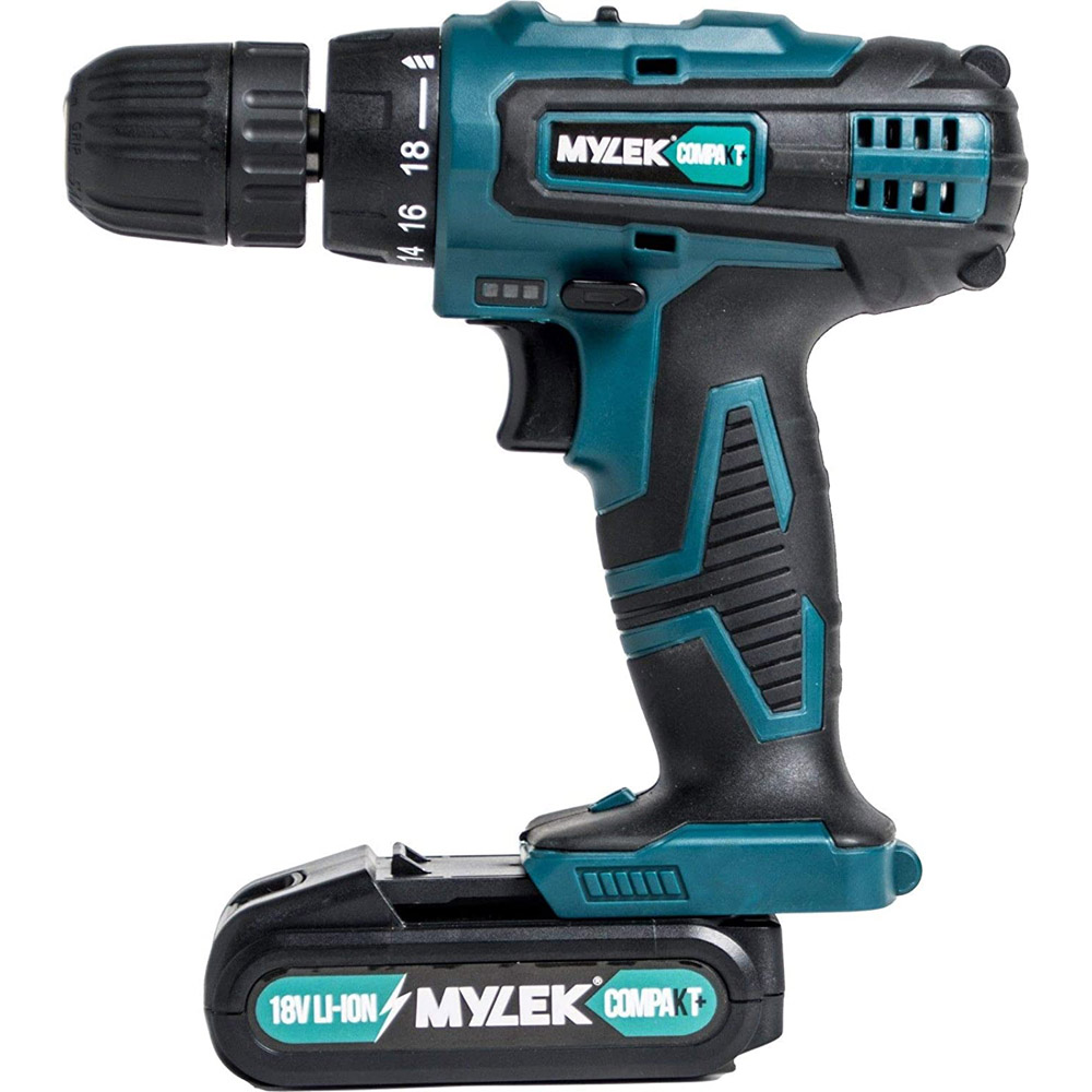 The MYLEK Two Speed 18V cordless drill/driver is a reliable, multi-purpose drill that can be used for a variety of DIY tasks around the home and garden. The drill comes with a 13-piece accessory kit that slots nicely into the handy carry case (along with the drill and charger) for safe storage and transport. The drill is designed with comfort and durability in mind to help reduce fatigue when carrying out heavy-duty tasks, enabling you to provide a professional finish! Powerful Design. This MYLEK drill will easily drill through wood, metal, as well as other materials! To make this drill safe in all climates, it has an LED light for you to use when it's dark. This will help you to see clearly and prevent any accidents from occurring! With variable speed control and a unique electric safety brake system, you'll have smooth drilling into the surface you're using it on. The Li-ion battery pack provides a high-power output level. Choose to buy this drill with a spare battery for even more battery life! This MYLEK drill has 2-speed settings to allow you to do your DIY jobs easily. It also has a sturdy shock absorbent design and 18+1 torque settings (max torque 28Nm).
