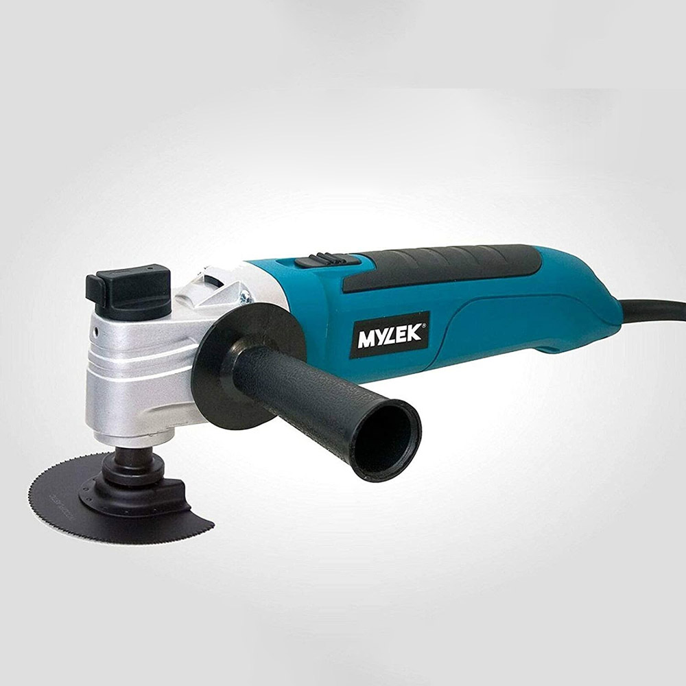 This MYLEK multi-tool kit has six variable speeds to choose from, making this one of the safest ways to saw, trim, cut and sand all varieties of materials, including copper pipes, plastic pipes, soft non-ferrous metals, plasterboard, laminates, wood, carpets, ceramic tiles and also removing tough sealants and grouts. The no-hassle, tool-free lever-type lock system conveniently allows you to quickly change to the correct blades needed for the correct task and limits your downtime. No hex key is required. The powerful 300W motor allows you optimum control to change the speed from 15000 to 22000 Oscillations per minute, making cutting, sawing, trimming, grinding and sanding easy and saving you time. It is fitted with a robust metal gearhead designed for long life and durability. The compact tool body, ergonomic soft grip and additional side handle provide comfortable optimal handling and control of the tool while working in inaccessible or hard to reach places. It also has a flexible scraper blade ideal for removing floor coverings and adhesive, a Bi-metal steel cutting blade for wood, plastic and metal, a Semi-circular blade for use with soft metals, wood, plastic, drywall, plasterboard carpet and plastic pipes, fine wood blade for finer cuts and attachment for sanding, which comes complete with 40 sanding sheets (15 x 60 grit, 15 x 80 grit and 10 x 120 grit) and is supplied with a sturdy storage case.