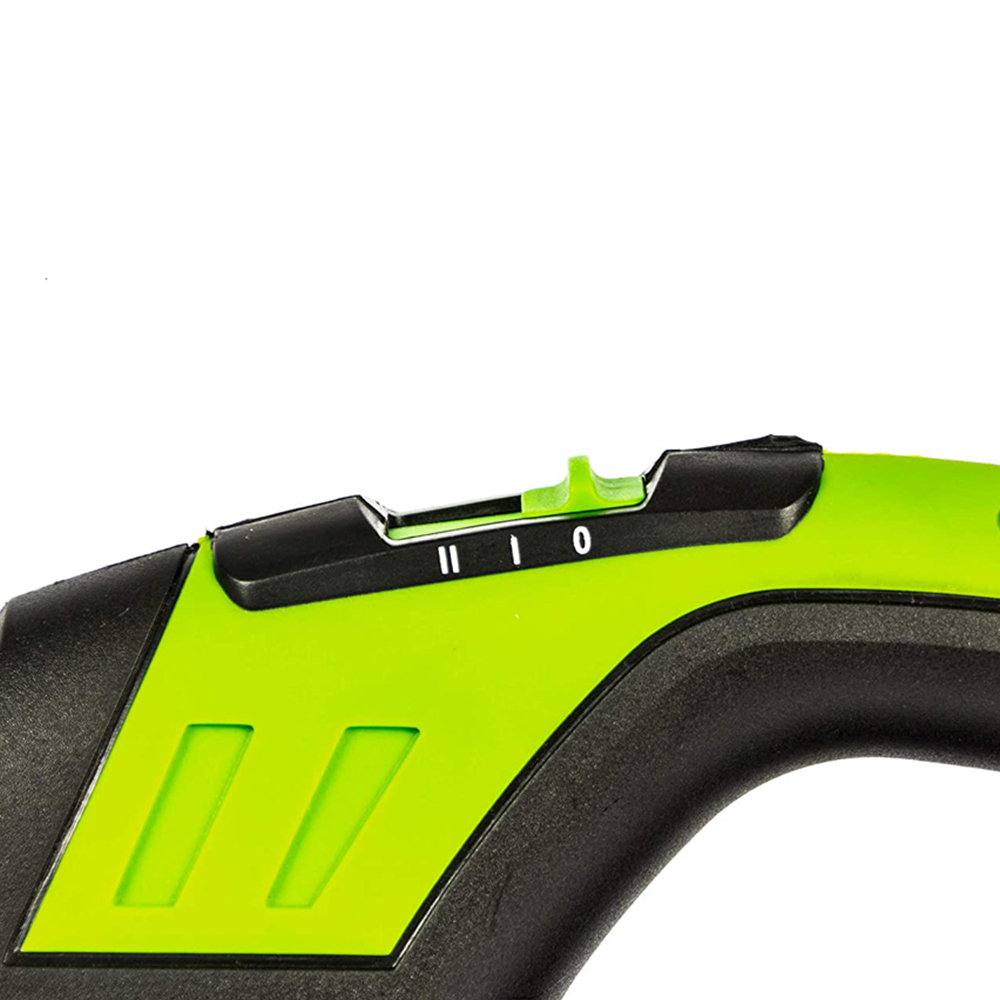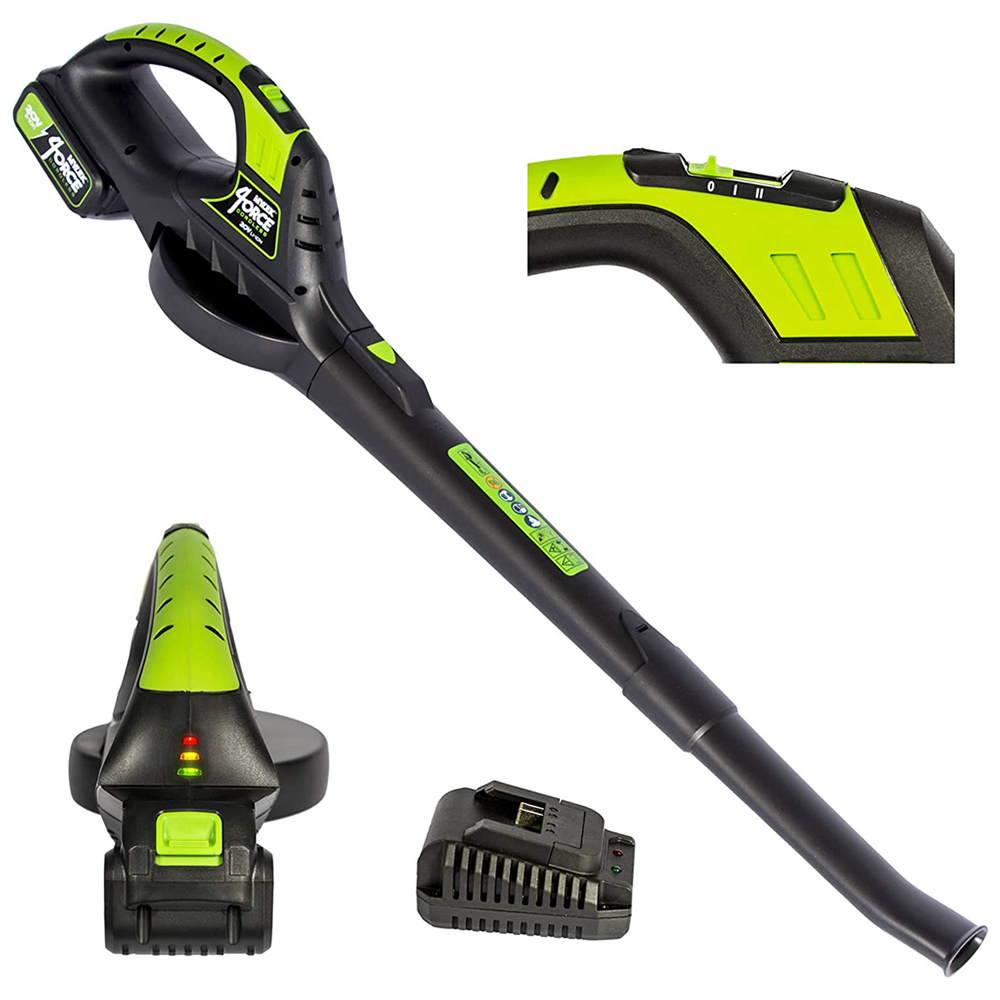 Keep your garden clean and tidy with this Mylek 4orce Cordless Leaf Blower. The high-performance leaf blower is designed to make your gardening life much easier, with a high-velocity motor and a precision nozzle that’ll let you tidy up even the largest gardens within minutes. Select one of two power settings to switch between an airflow of 80kph and 120kph, which gives you a lot of flexibility. If you only need to get rid of a few leaves or bits of sawdust, the lower power setting will give you more battery life. If you need to remove larger bits of debris, push it into high gear to get the extra power you need! Each unit comes with two nozzles which extend the reach and direct the airflow of your leaf blower. You can use one or both of these nozzles as required to make your work a little easier. With a lightweight design and an ergonomic soft-touch rubber grip, this leaf blower is a tool that’s comfortable to hold, even for long periods. This leaf blower isn’t just great for leaves – it can tackle almost any common garden debris like twigs and bits of dirt. It can even handle larger things like wood chips and bits of rubble, so the leaf blower is great for clearing up after building work. The 20V Li-ion 4000 mAh battery charges in as little as one hour, so you won’t be left without power for very long. You’ll also never be caught out by a flat battery thanks to the battery life indicator, which shows you exactly how much power you have left at a glance.