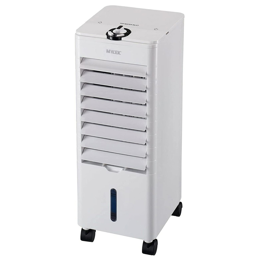 Make your home feel nice and cool with the MYLEK White Air Cooler with Remote 4L. The cooler uses a natural process known as evaporative cooling to chill the air – this involves allowing a tank of water to evaporate, which dramatically cools the air. It also uses no additional energy when compared to a tower fan – this unit uses just 75W power, so it’s good for your energy bills and kind to the planet. Featuring three fan speed settings – it is perfect for those blisteringly hot summer days. With a swing setting – it circulates cool air around the room, so it’s great for use in larger areas like your living room. Designed to be lightweight and easy to wheel around – you can easily push it around to place it in the perfect spot. On very hot days, you can cool things down even further using the four free ice packs.