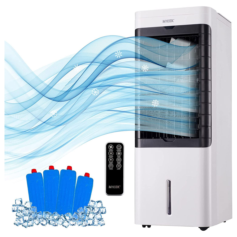 Add a refreshingly cool touch to your living space with the MYLEK White and Black Air Cooler with Remote 6L. The air cooler uses a natural process known as evaporative cooling to chill the air – this involves allowing a tank of water to evaporate, which dramatically cools the air. It also uses no additional energy when compared to a tower fan – this unit uses just 75W power, so it’s good for your energy bills and kind to the planet. Featuring three fan speed settings and three fan modes – it gives you the option of a pulsing airflow that imitates a natural breeze. With 12 hourly countdown timer settings – it is perfect for nighttime use. It also includes a remote control that allows you to adjust your settings without ever leaving your seat. Designed to be lightweight and easy to wheel around – it is easy to push around any place. With a large 6L tank – it ensures you won’t have to constantly refill it. On very hot days, you can cool things down even further using the four free ice packs.