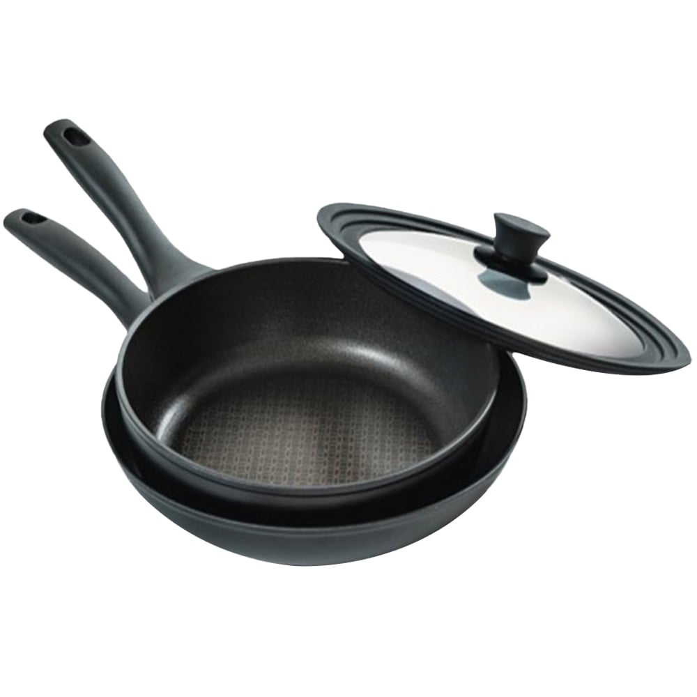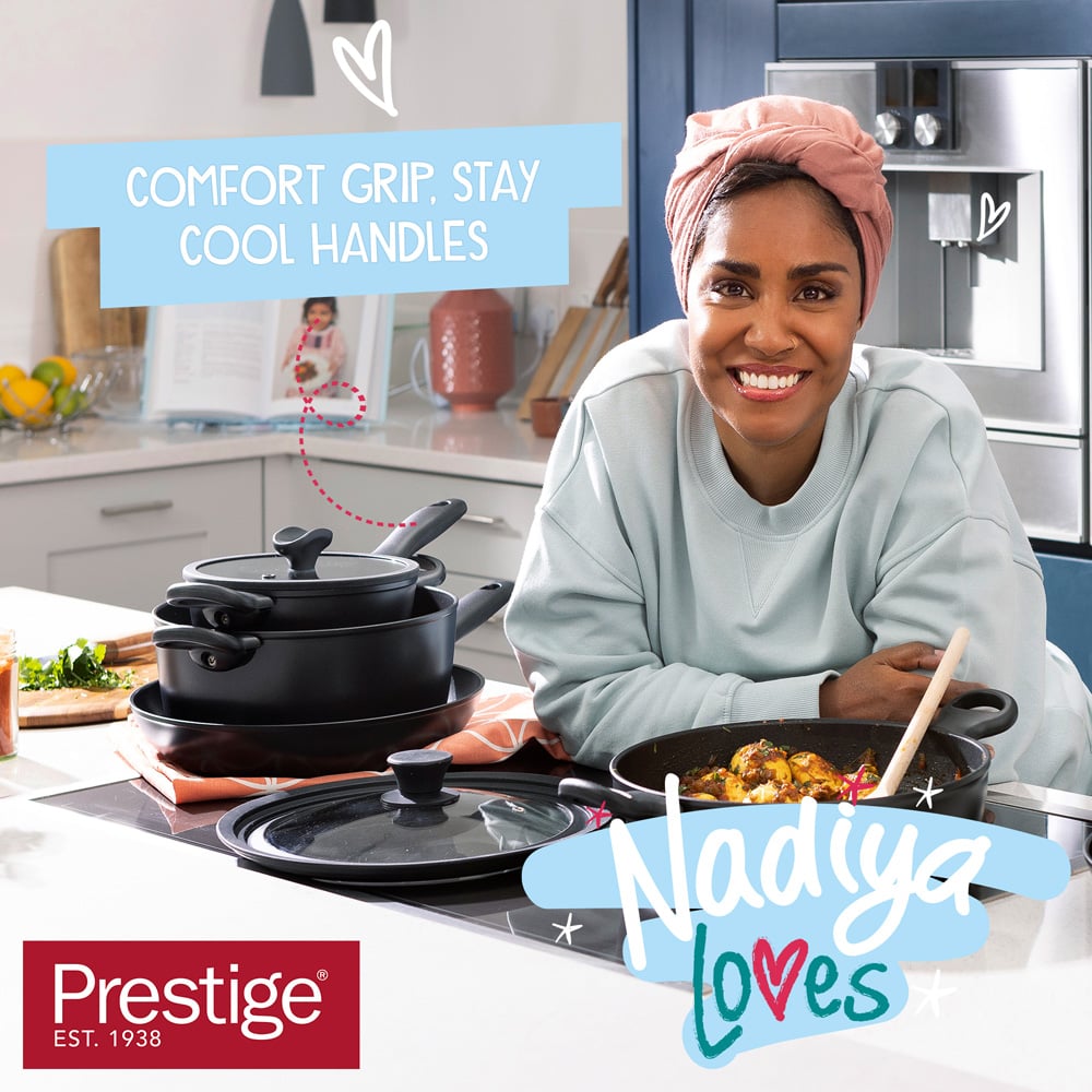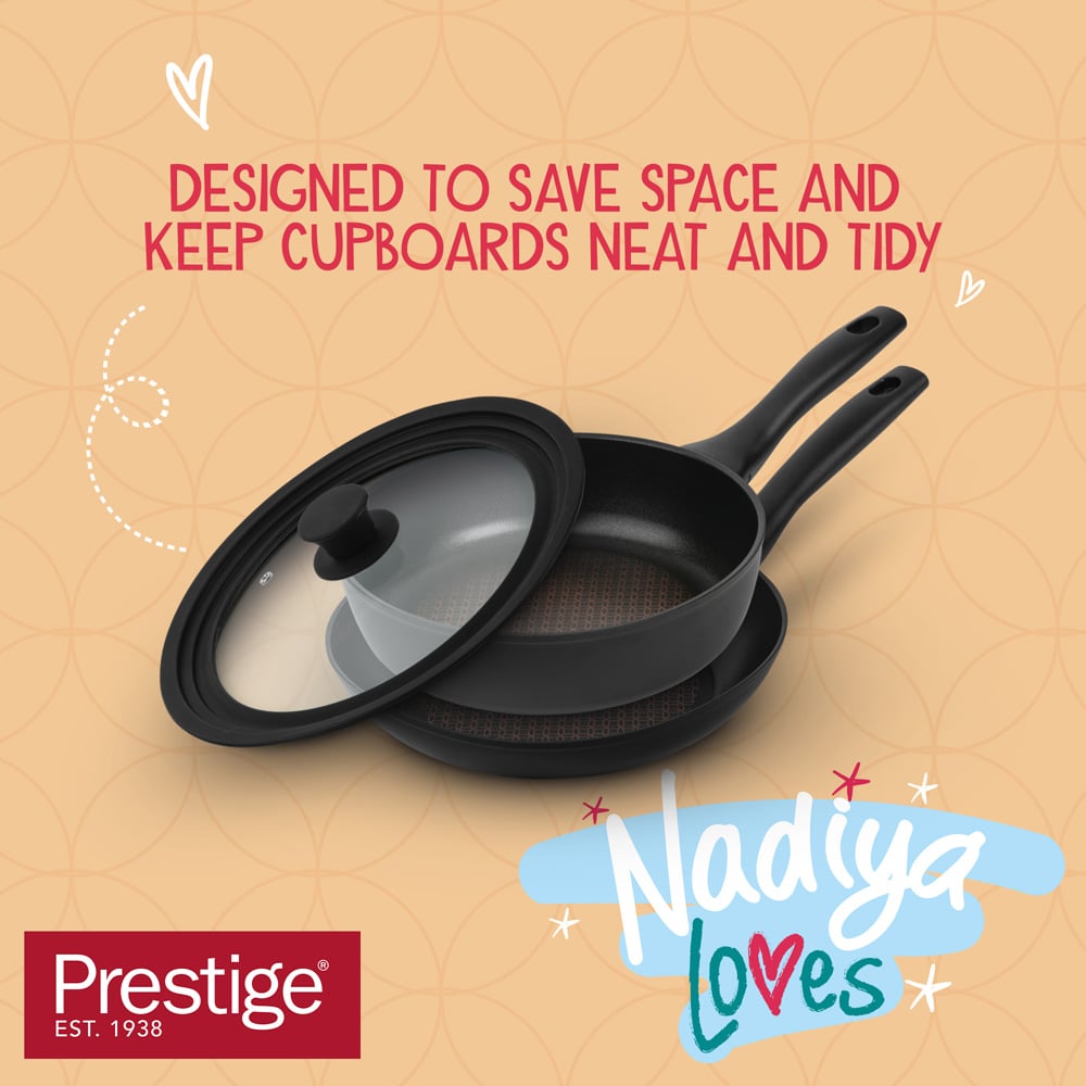 Prepare delicious meal effortlessly using the Nadiya x Prestige Stackable Frying Pan with lid. These frying pans are intelligently designed to be non-stick, ensuring a hassle-free cooking and cleaning experience. Moreover, their unique nesting feature allows them to fit snugly together, optimising space in your kitchen cabinets. The set includes a versatile lid that can be used with various pan sizes. This twin pack comprises a 24cm and 26cm pan, accompanied by a multi-size universal lid that perfectly fits most 24cm, 26cm, and 28cm pans. The interior of these pans is PFOA free, guaranteeing safe cooking, while the non-stick surface showcases an elegant gold accent detail. Crafted from super stackable aluminium, these pans can be conveniently stored, and the glass lid effectively seals in nutrients, while the soft close silicone edge safeguards the pan edges.
