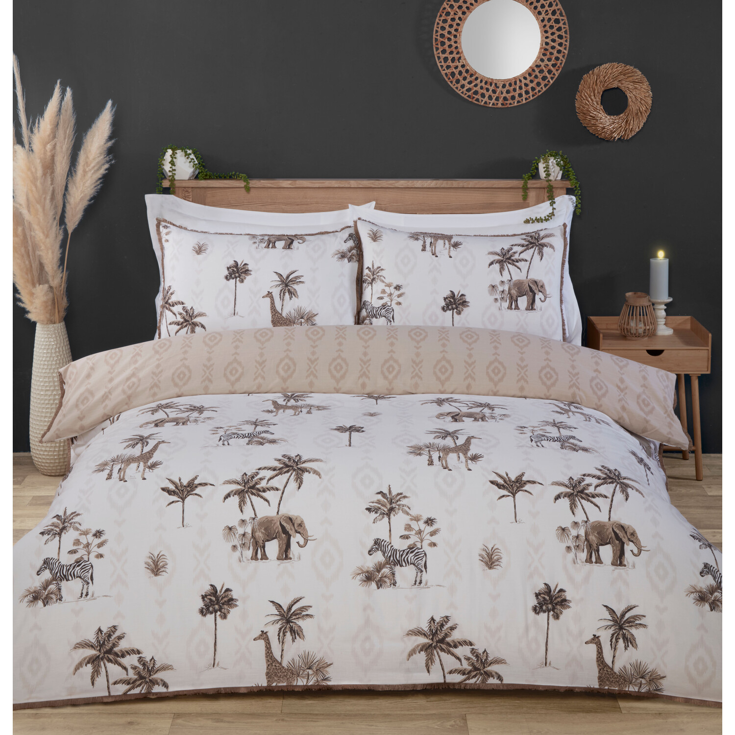 Bring a soothing safari feel to your bedroom with this Nahara Duvet Cover and Pillowcase Set. Featuring a selection of animals and trees in neutral hues, this reversible bedding set would be a fantastic addition to a bohemian aesthetic. The pillowcases and duvet cover boast a fringe trim for added texture and style that's sure to look great in your home.
