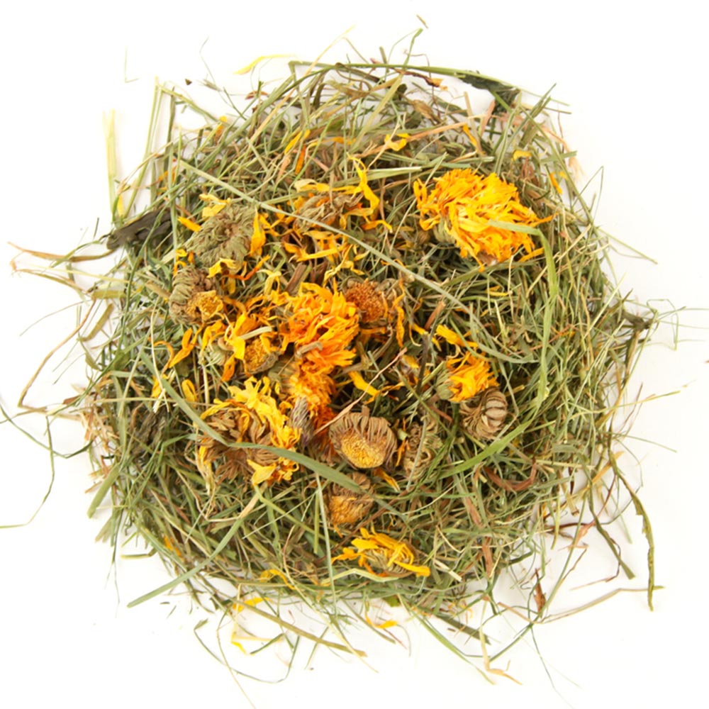Timothy Rich Hay is a unique mix of grasses, rich in Timothy with added Dandelion and Marigold. The added vegetables and flowers help to stimulate foraging activity and can encourage even the fussiest of eaters. Each bale is individually packed and hermetically sealed in a compostable, plastic-free film that helps keep the hay fresh for longer, which makes storage easy and causes less mess. The film can be reused as a liner for your green waste caddy.