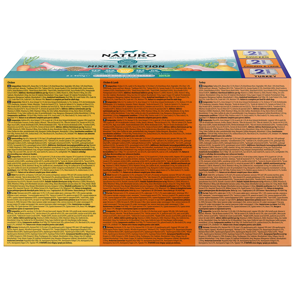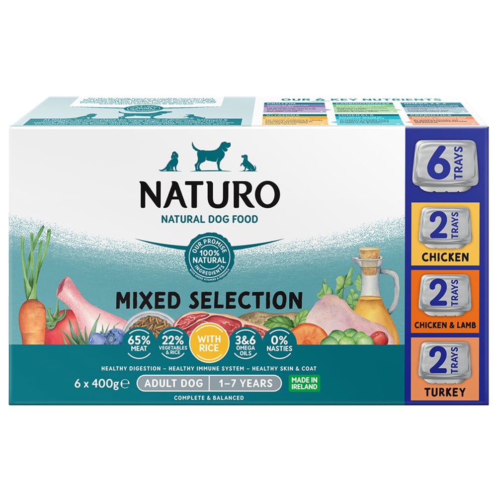 Treat your dog with a nutritious meal with Naturo Natural Variety Pack with Brown Rice Adult Dog Food 400g 6 Pack. It includes vegetables, meat and brown rice for an ideal energy-packed meal. To promote a healthy and shiny coat, it includes Omega-3 and 6. Also contains added vitamins and minerals to support your dog's immune system. Made with all natural ingredients with no artificial flavours, colour, or preservatives.