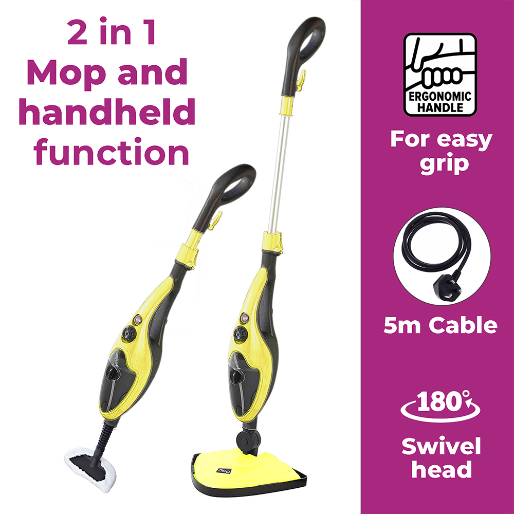 The Neo Steam Mop has a large 400ml water tank, a huge 1500 watts of power and a long 5 metre cable to help accomplish your cleaning chores in a breeze with a vast range of accessories also included. Accessory Kit Includes: Measuring Cup, Window / Glass Cleaner, Round Small Brass Brush, Grout / Slender Brush, Scraper Tool, Carpet / Fabric Tool, Glider, Jet Nozzle, Nylon Brush, and Washable Micro Fibre Cloth Pad (Quantity dependant on your selection).