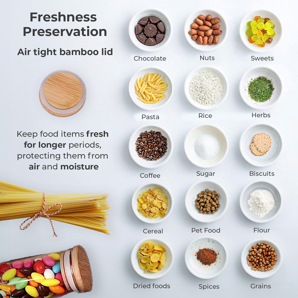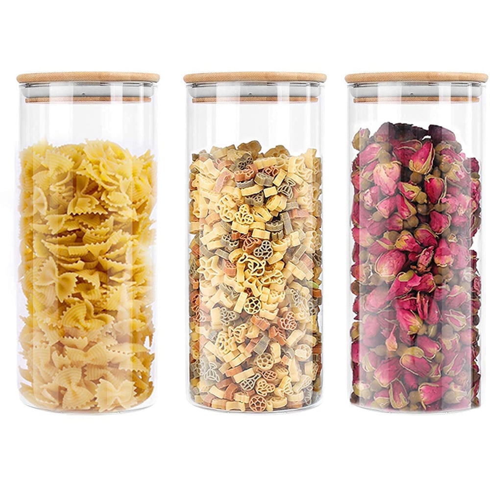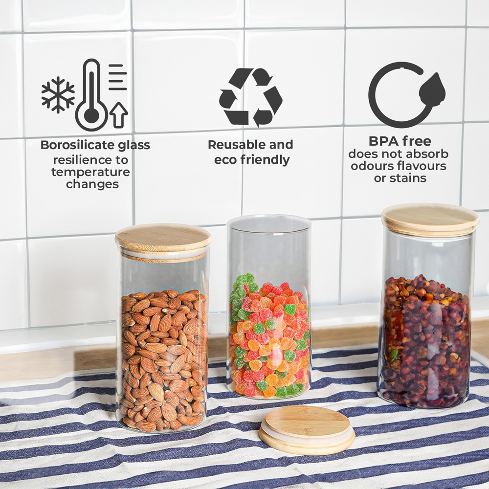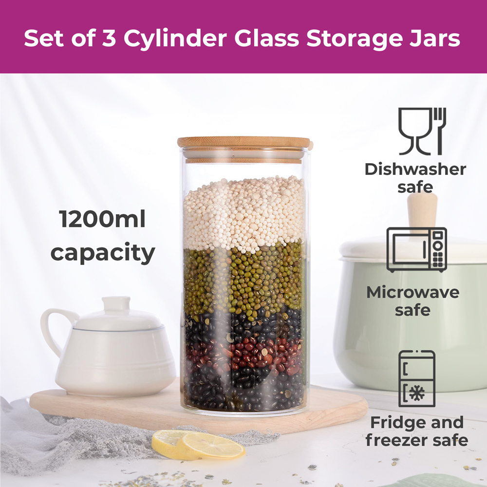A set of 3 cylinder glass containers with bamboo lids, each with a 1.2-liter capacity, is an ideal storage solution for keeping your kitchen organized while maintaining the freshness and quality of your food. This set combines the natural beauty of bamboo with the durability and clarity of glass, offering both functionality and style. The containers are made from high-quality, borosilicate glass, known for its durability, clarity, and resistance to temperature changes. The cylindrical shape is sleek and space-efficient, making it easy to store a variety of items. The lids are crafted from sustainable bamboo, which is naturally antibacterial and resistant to odors. Bamboo is an eco-friendly material, adding a touch of nature to your kitchen. The lids typically feature a silicone gasket that provides an airtight seal to keep food fresh.