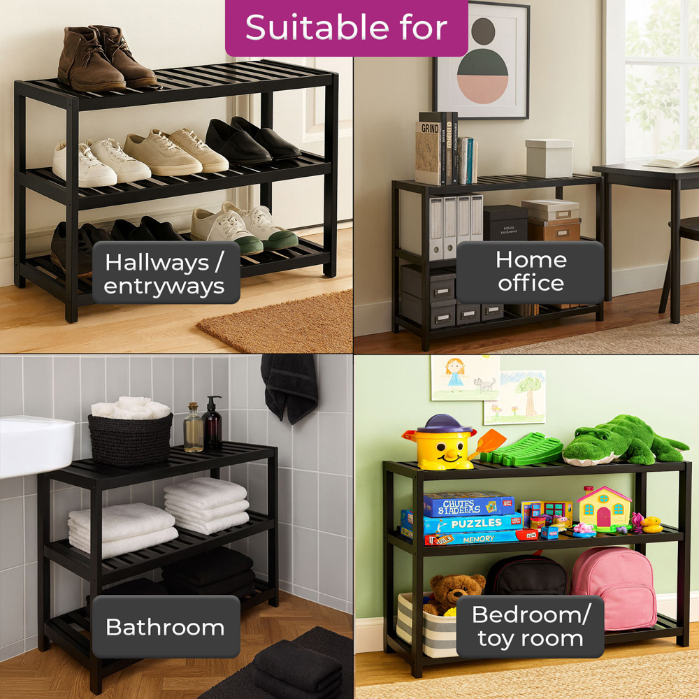 Transform any hallway or living space with the Neo 3 Shelf Black Bamboo Shoe Rack. Crafted from strong bamboo, it features three spacious slatted shelves that encourage airflow and help prevent dampness and odours, making it ideal for busy entryways or compact flats. The versatile design means you'll also find it handy for storing bags, accessories or decorative pieces, and assembly is a breeze with included fixings and instructions.