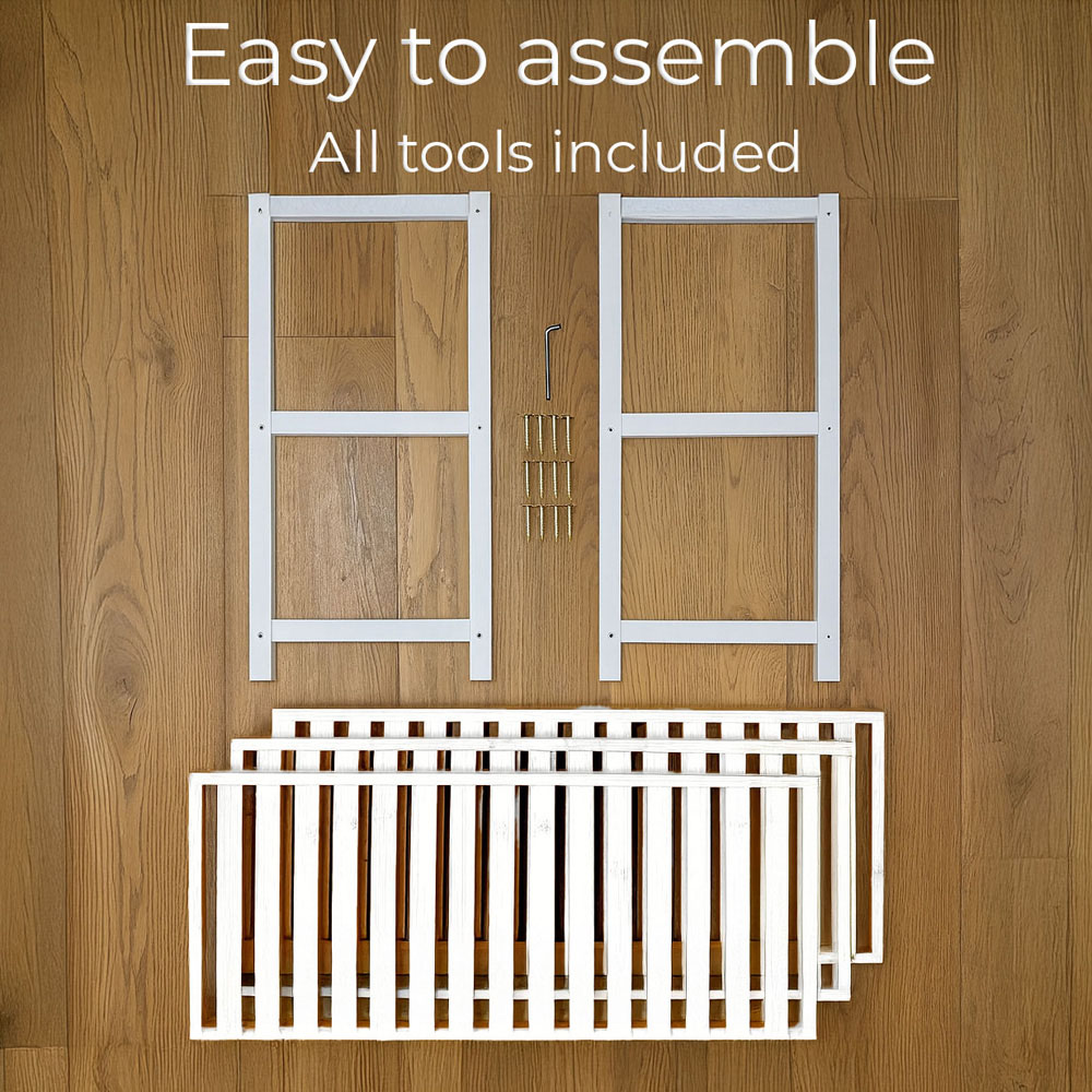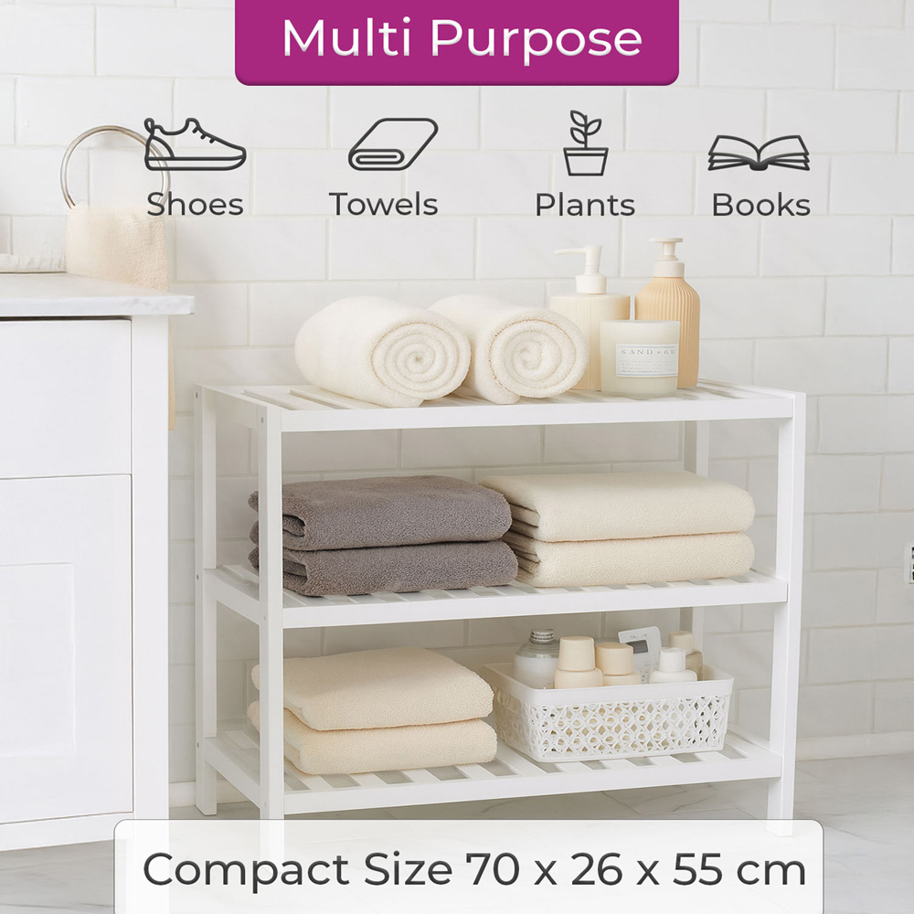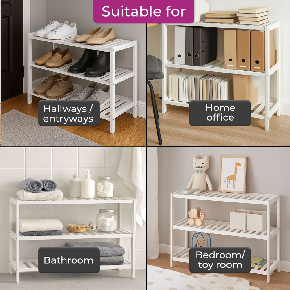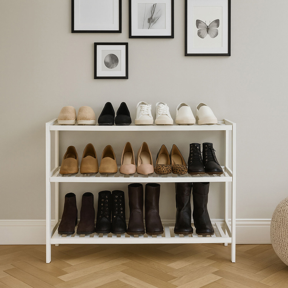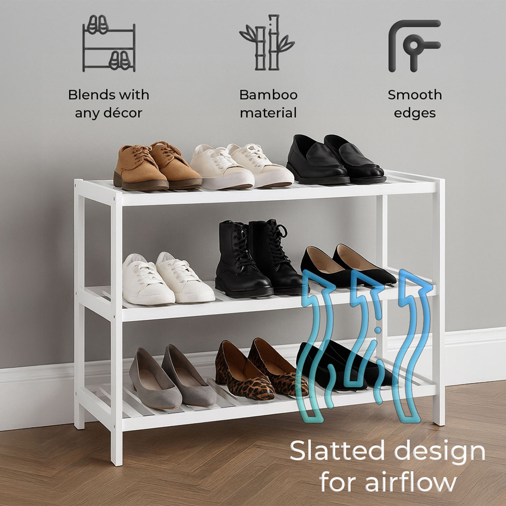 Transform any hallway or living space with the Neo 3 Shelf White Bamboo Shoe Rack. Crafted from strong bamboo, it features three spacious slatted shelves that encourage airflow and help prevent dampness and odours, making it ideal for busy entryways or compact flats. The versatile design means you'll also find it handy for storing bags, accessories or decorative pieces, and assembly is a breeze with included fixings and instructions.